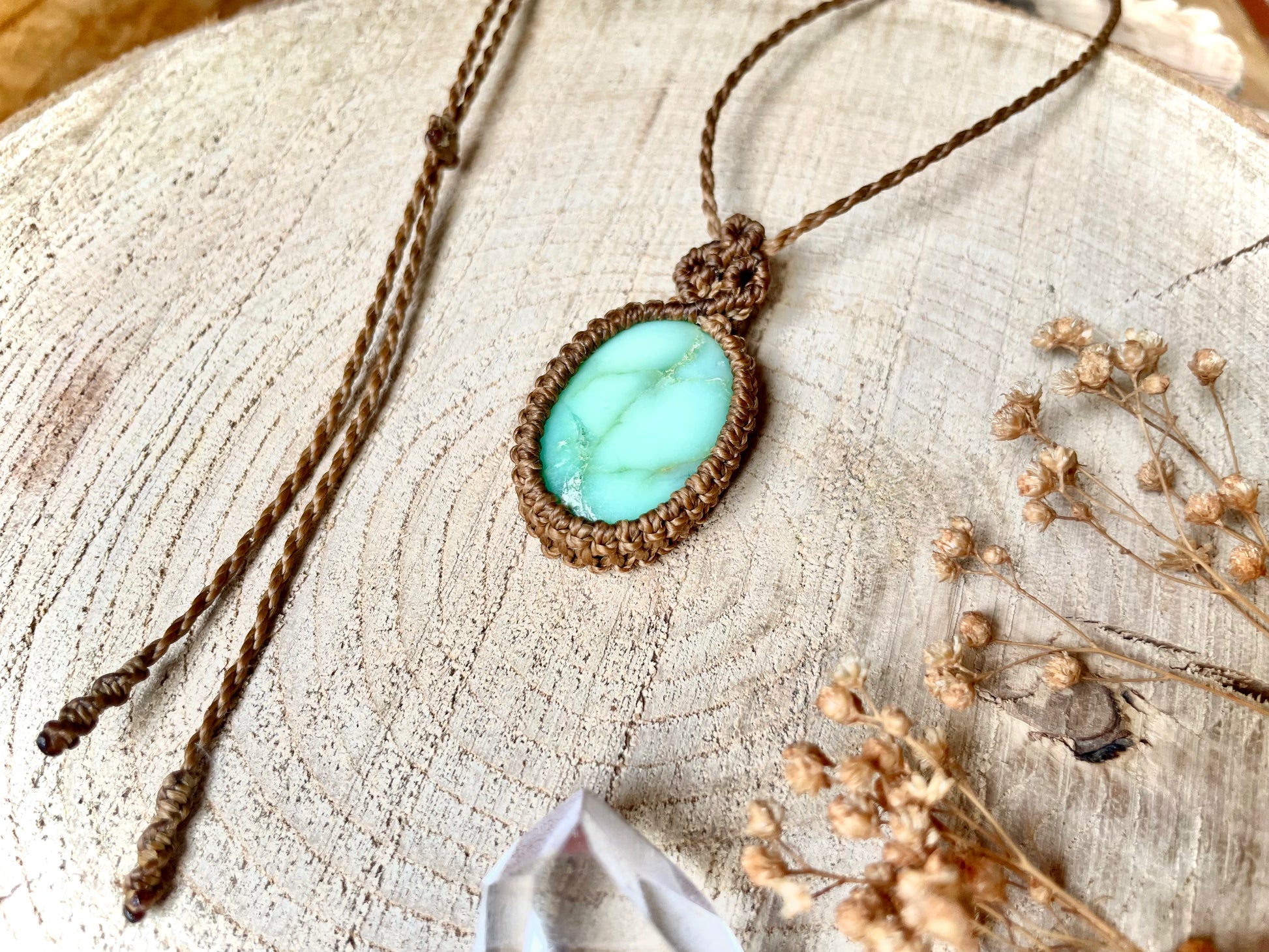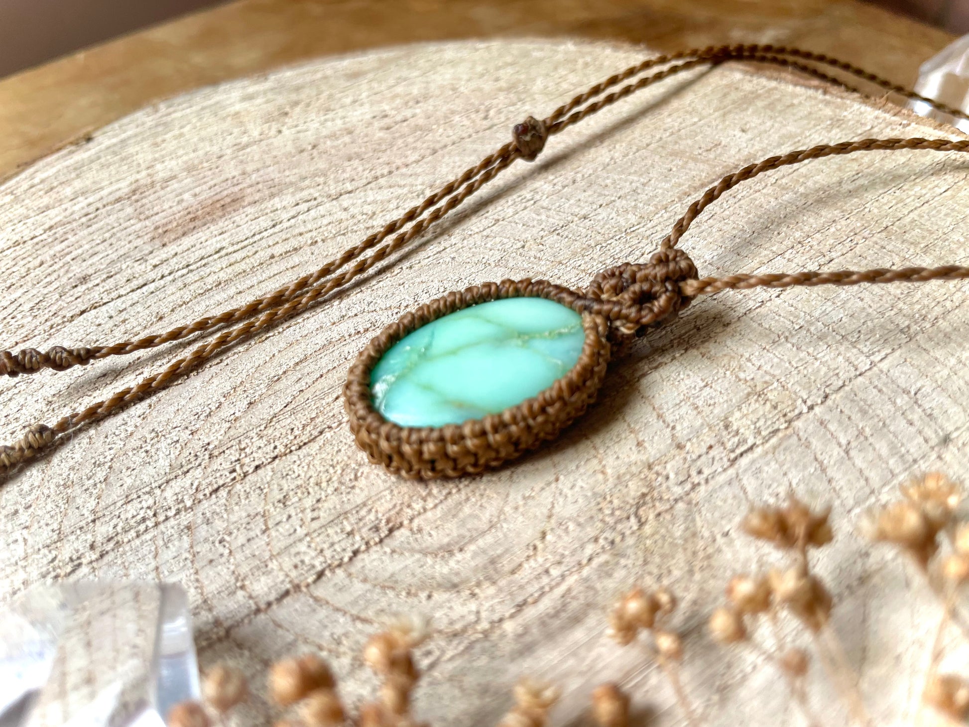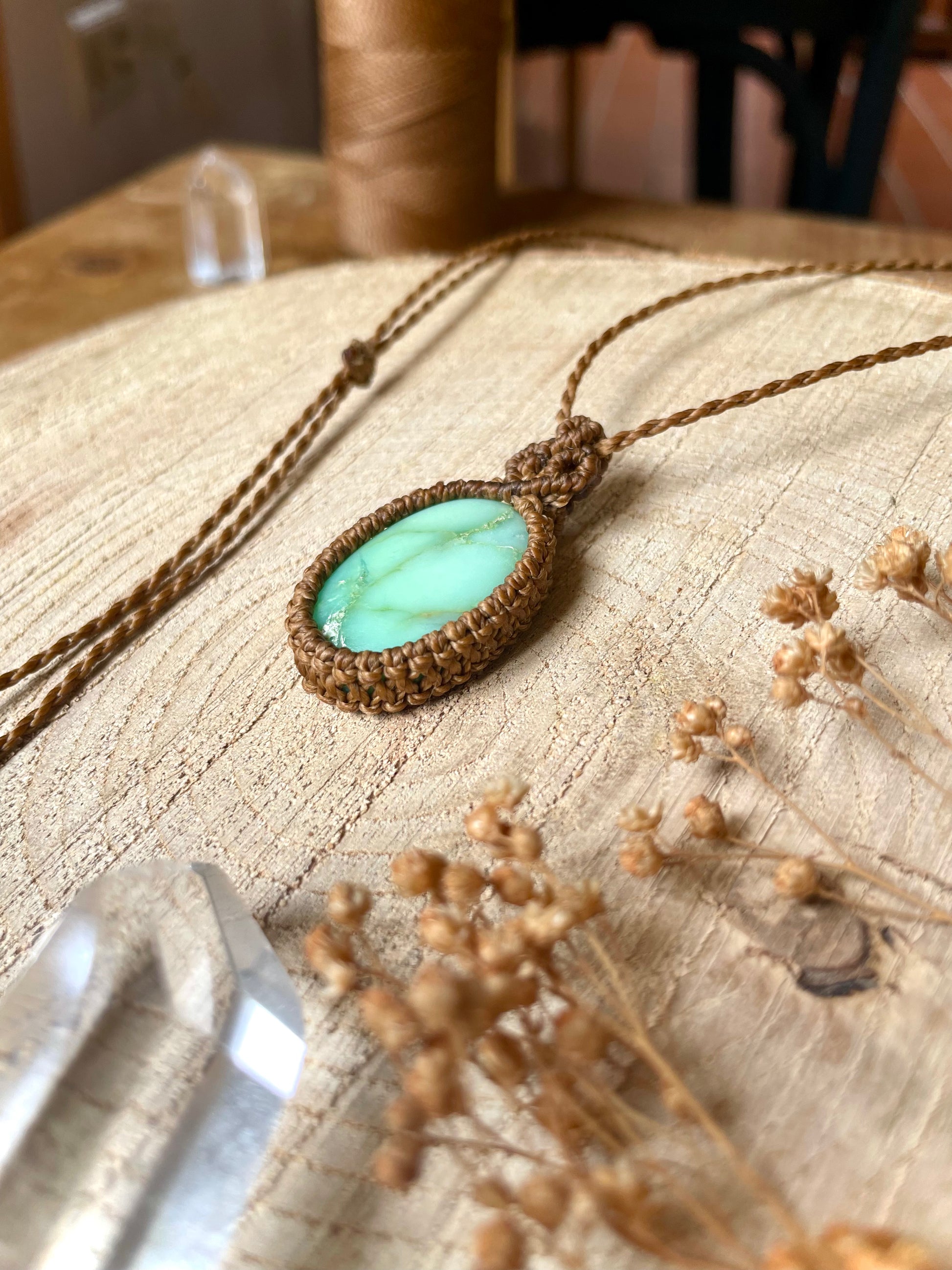 Colgante fino y sencillo para el día a día, con piedra Crisopasa tejido en hilo encerado de macramé marrón claro.