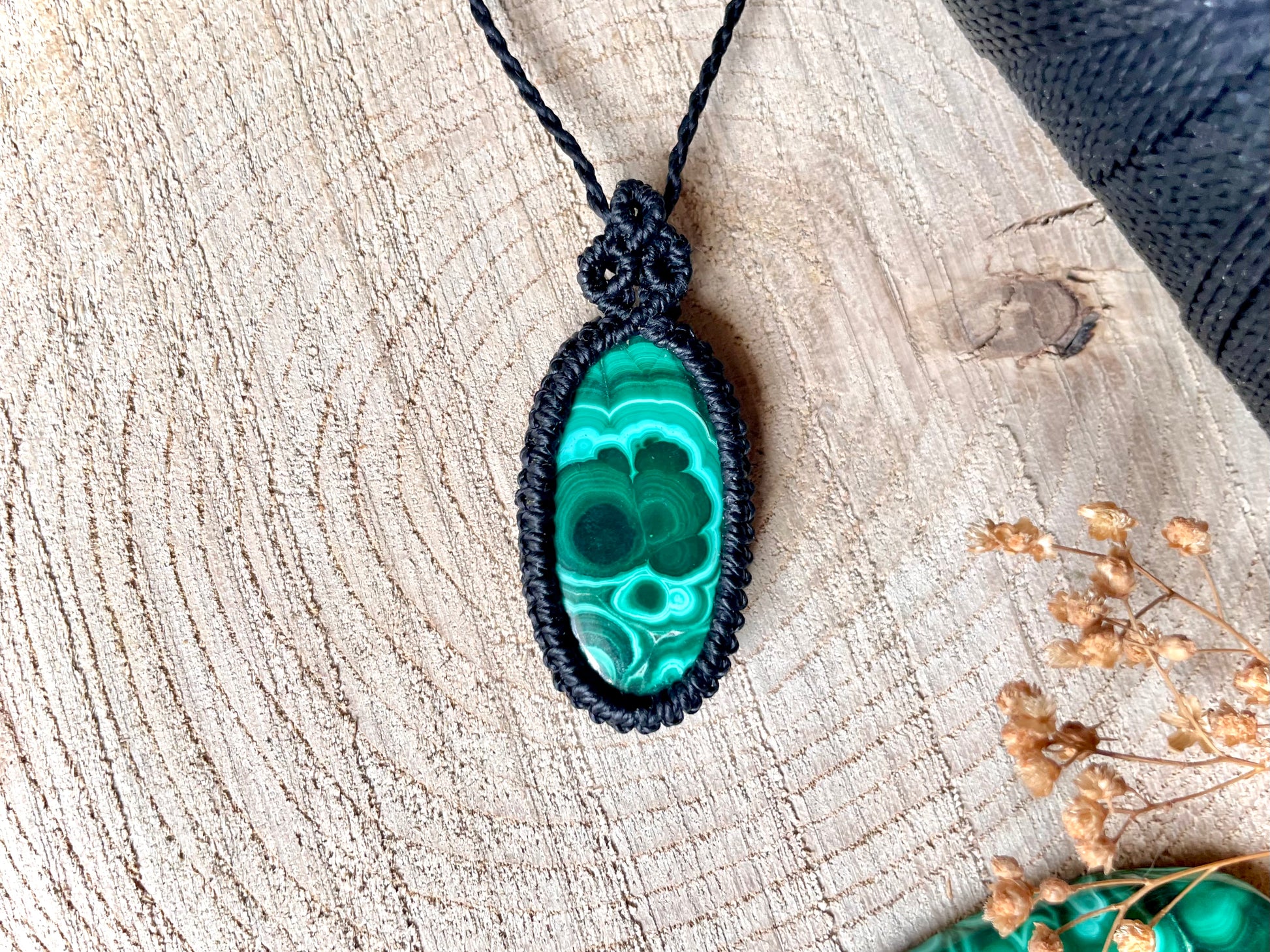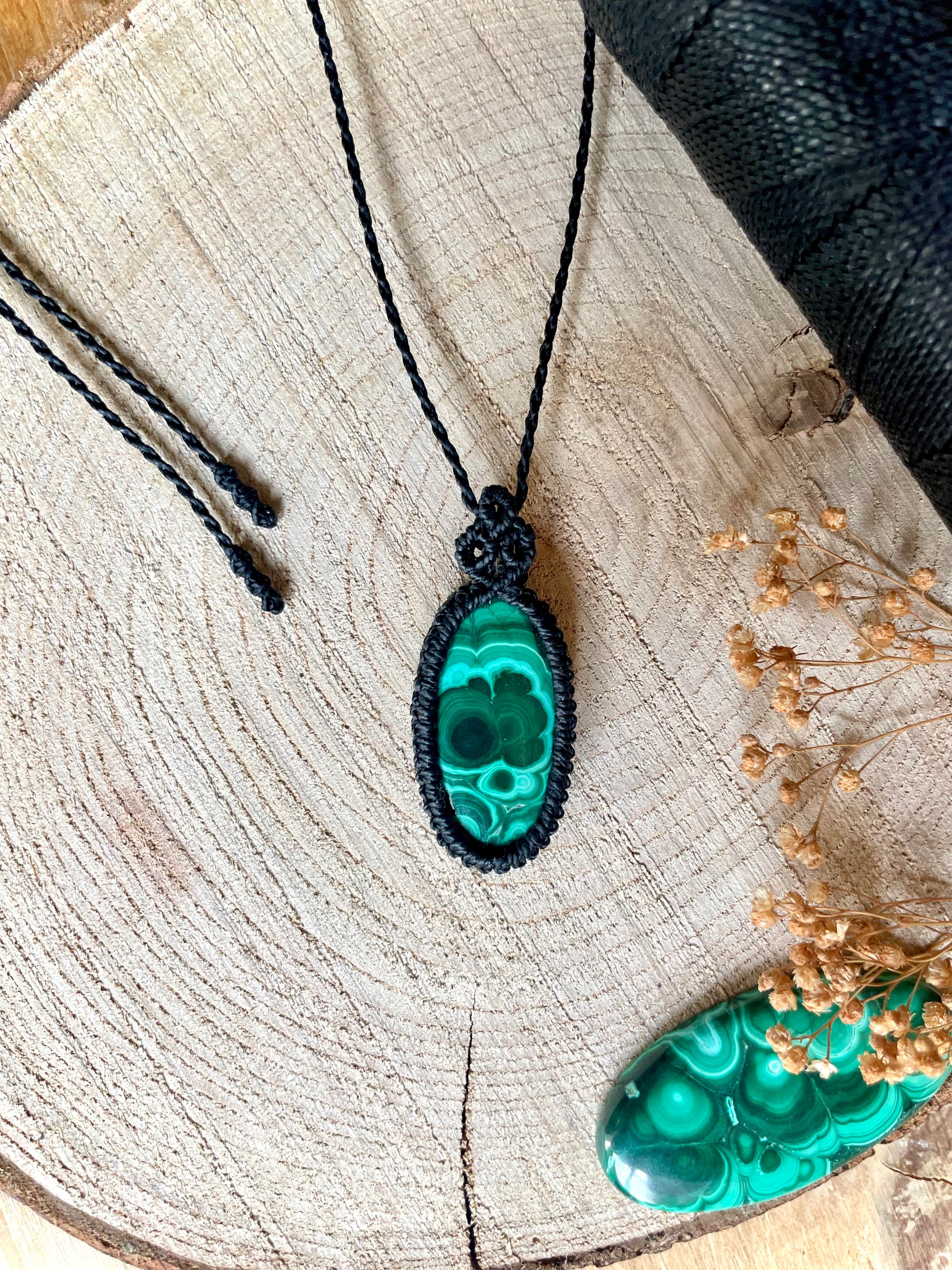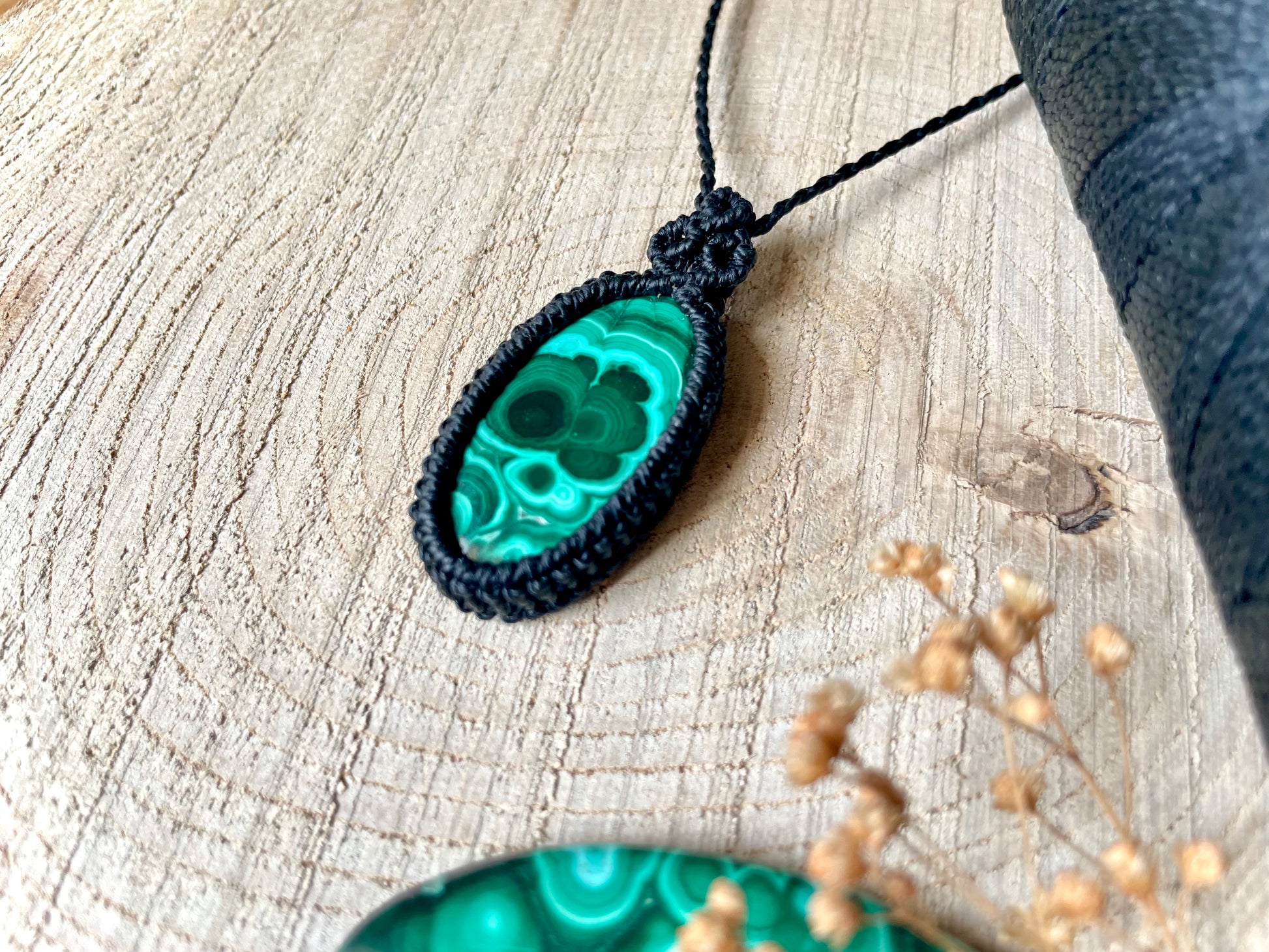 Un colgante sencillo para el día a día con piedra malaquita encastada en hilo encerado de macramé negro.