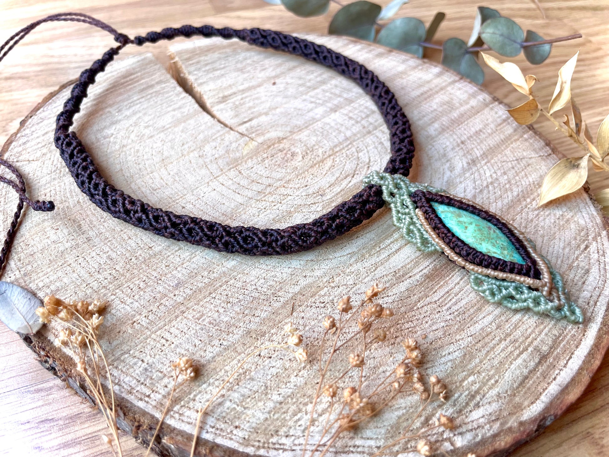 Cada nudo está trabajado con paciencia y cuidado, creando una pieza resistente y llena de simbolismo. La forma alargada del engaste realza la belleza de la piedra y convierte el collar en un amuleto especial para quienes buscan conexión con la naturaleza.