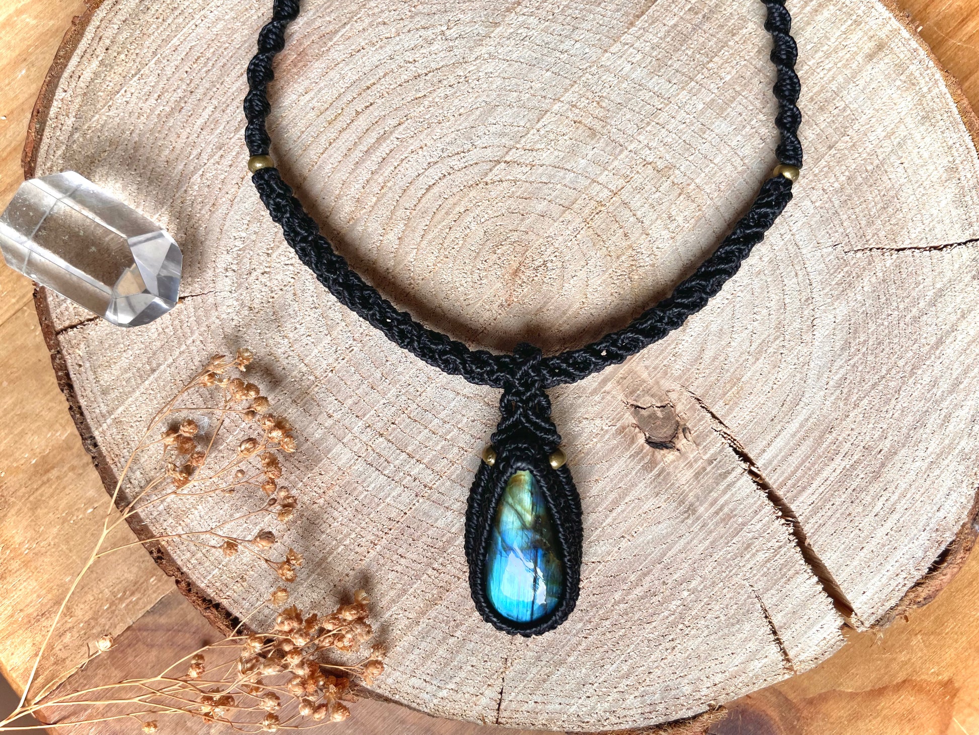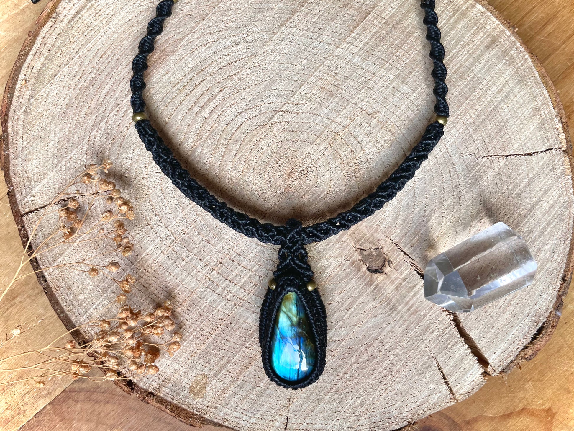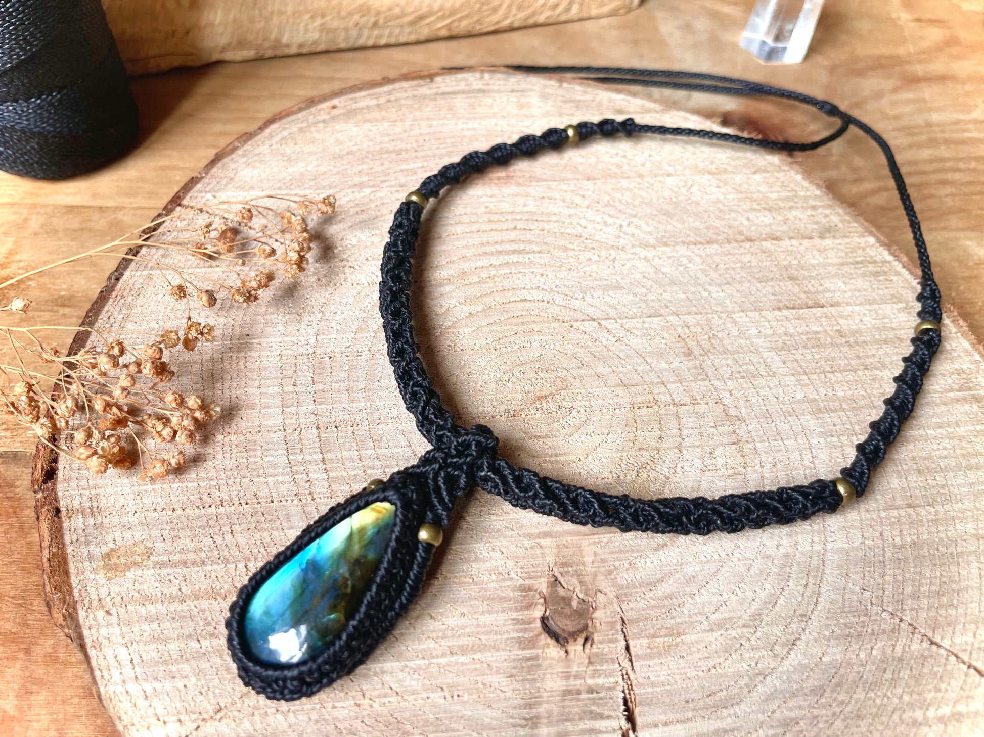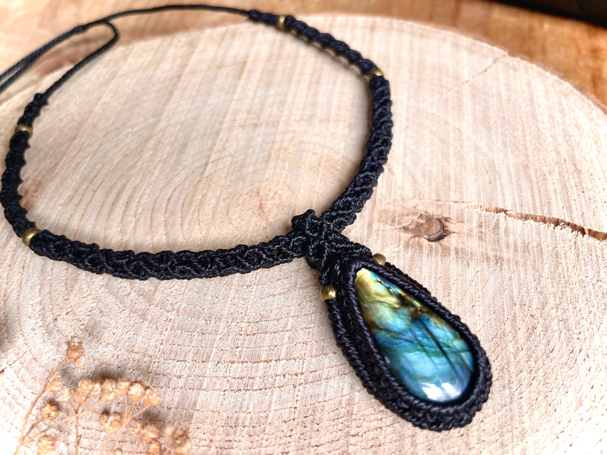 Llamativa piedra de labradorita con tonos azulados, engarzada en hilo negro encerado de macramé y sujeta a un collar estilo gargantilla con un tejido original.