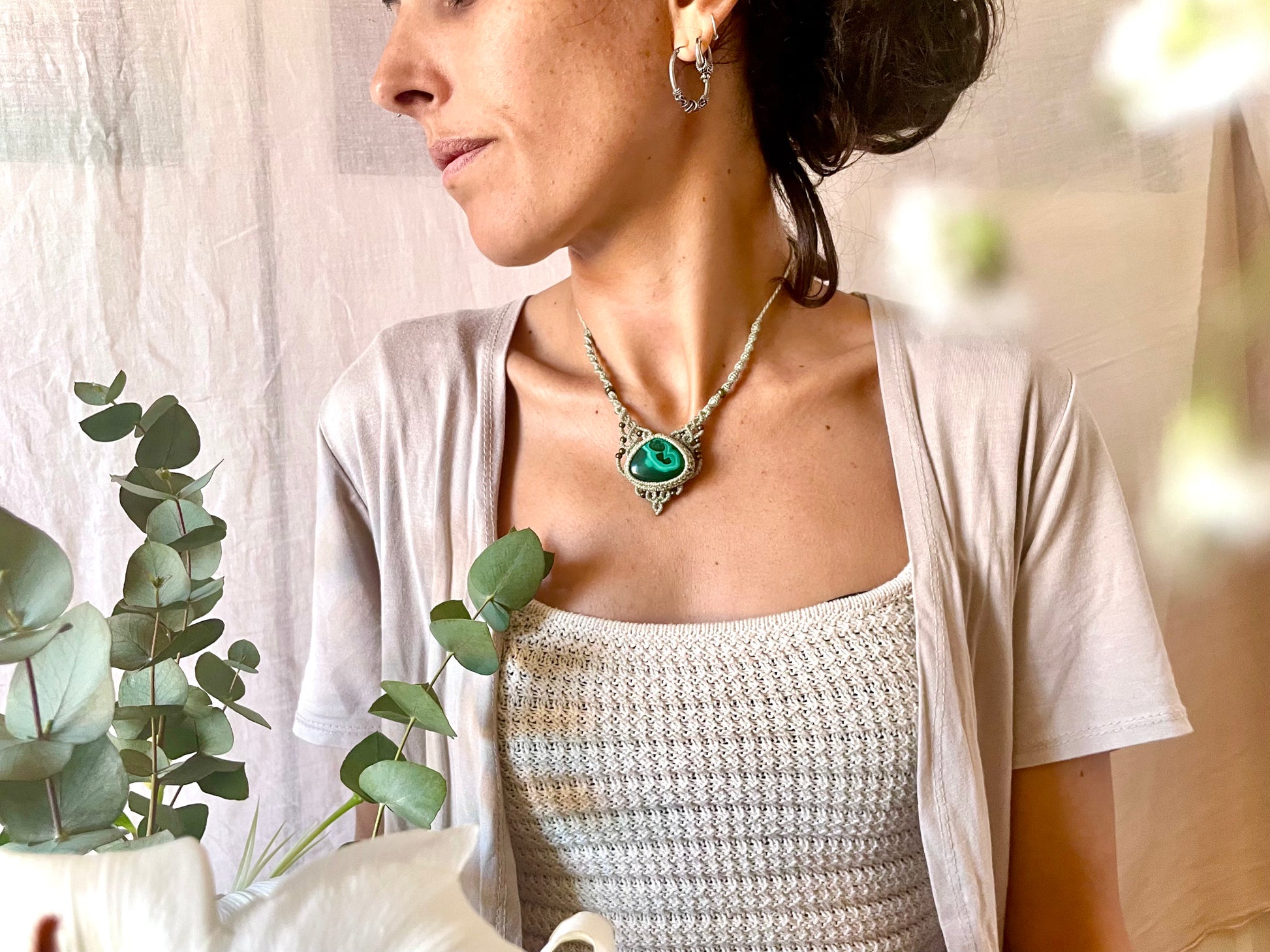 Un collar de diseño fino con detalles en latón y una malaquita con una energía muy especial. Si estás buscando aportar un toque bohemio y elegante a cualquier conjunto esta es tu joya.