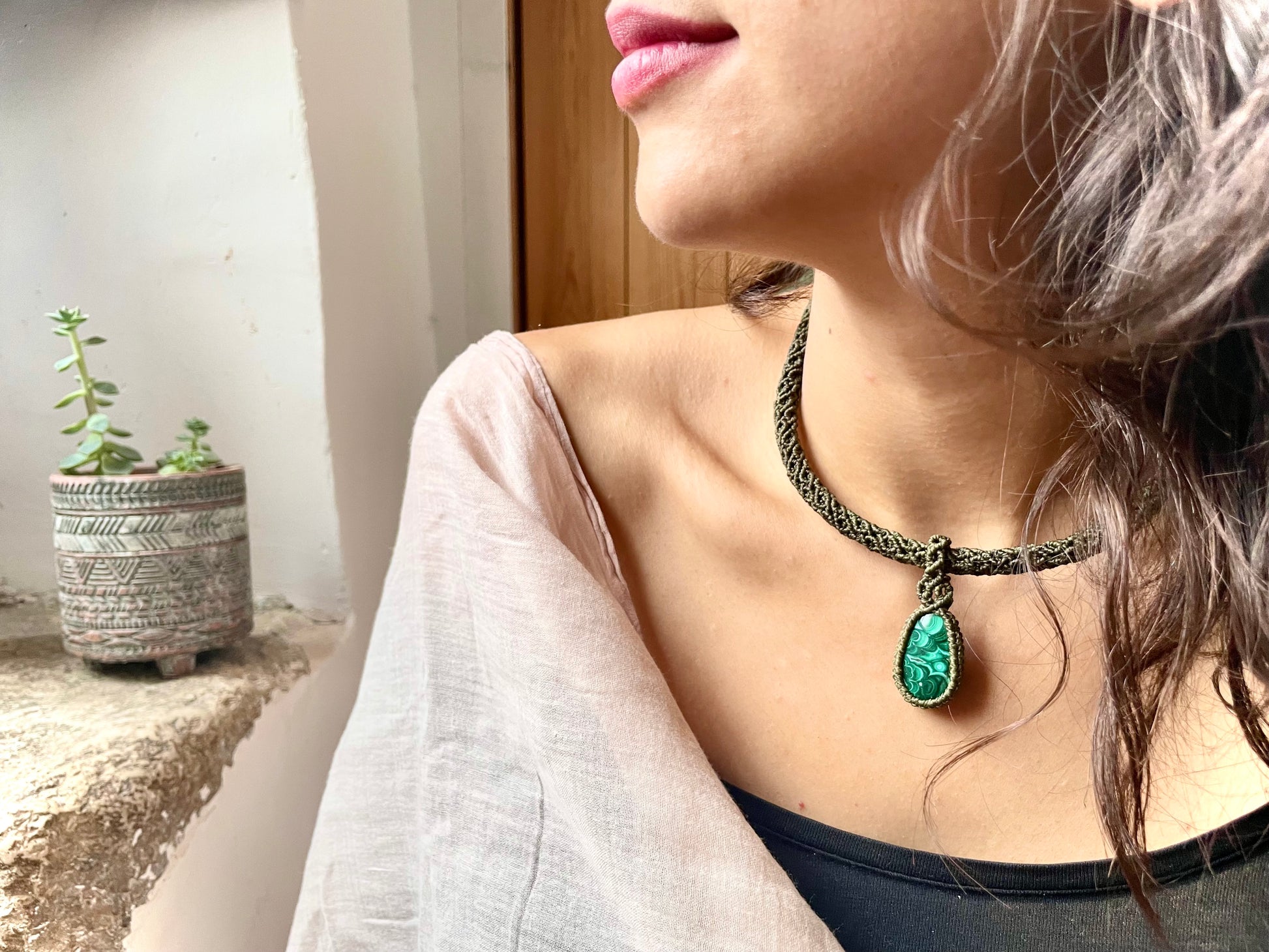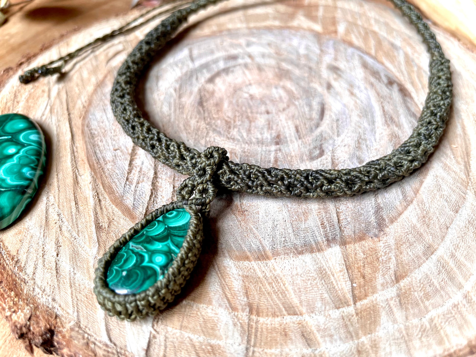 Collar con piedra malaquita que cuelga de un tejido hecho de forma tubular que podrás ajustar a la medida que desees.