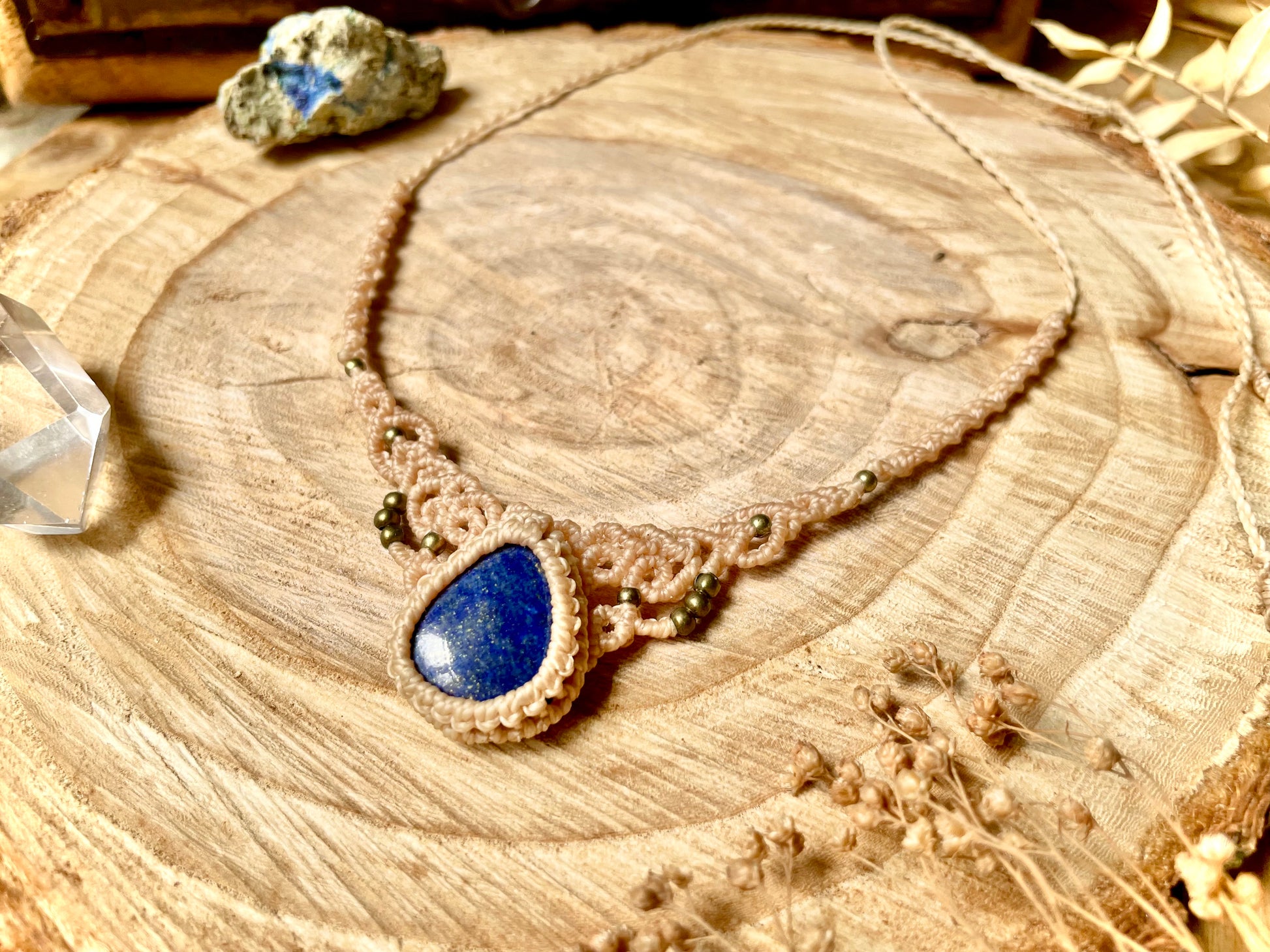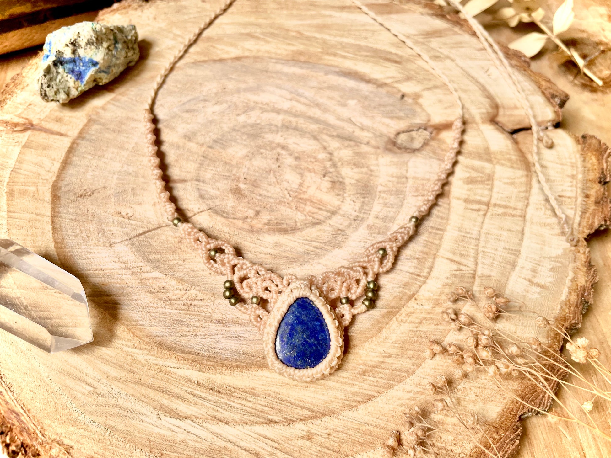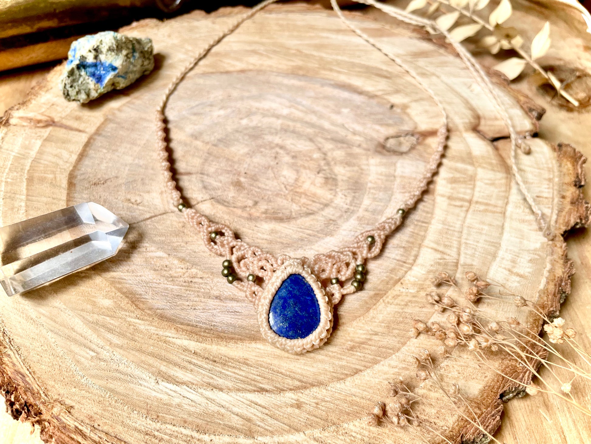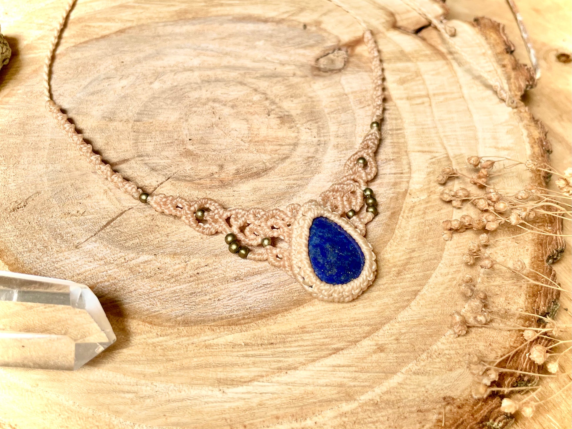 Collar estilo gargantilla en hilo blanco roto con piedra lapislázuli. Con cierre ajustable para poder llevarlo a la altura deseada.