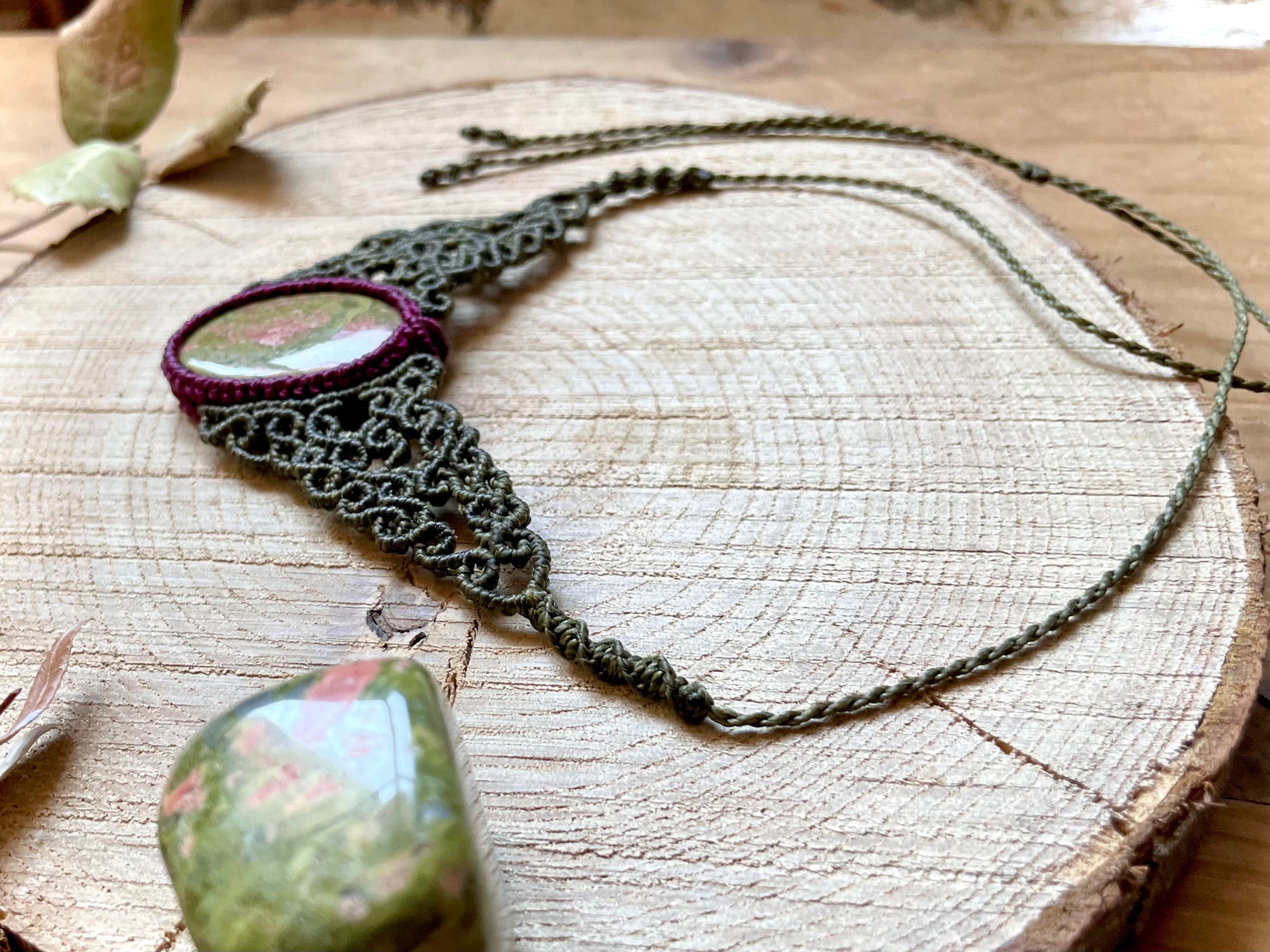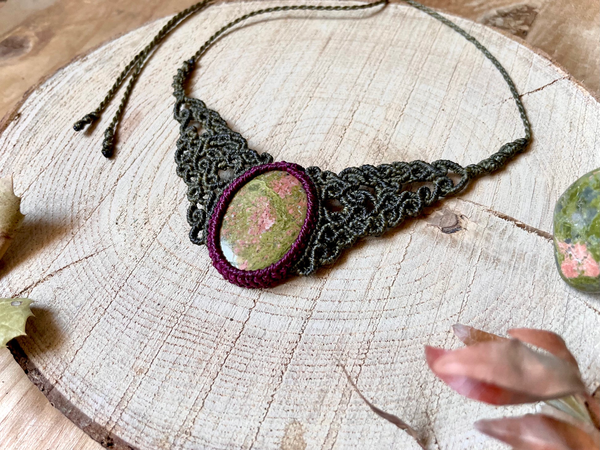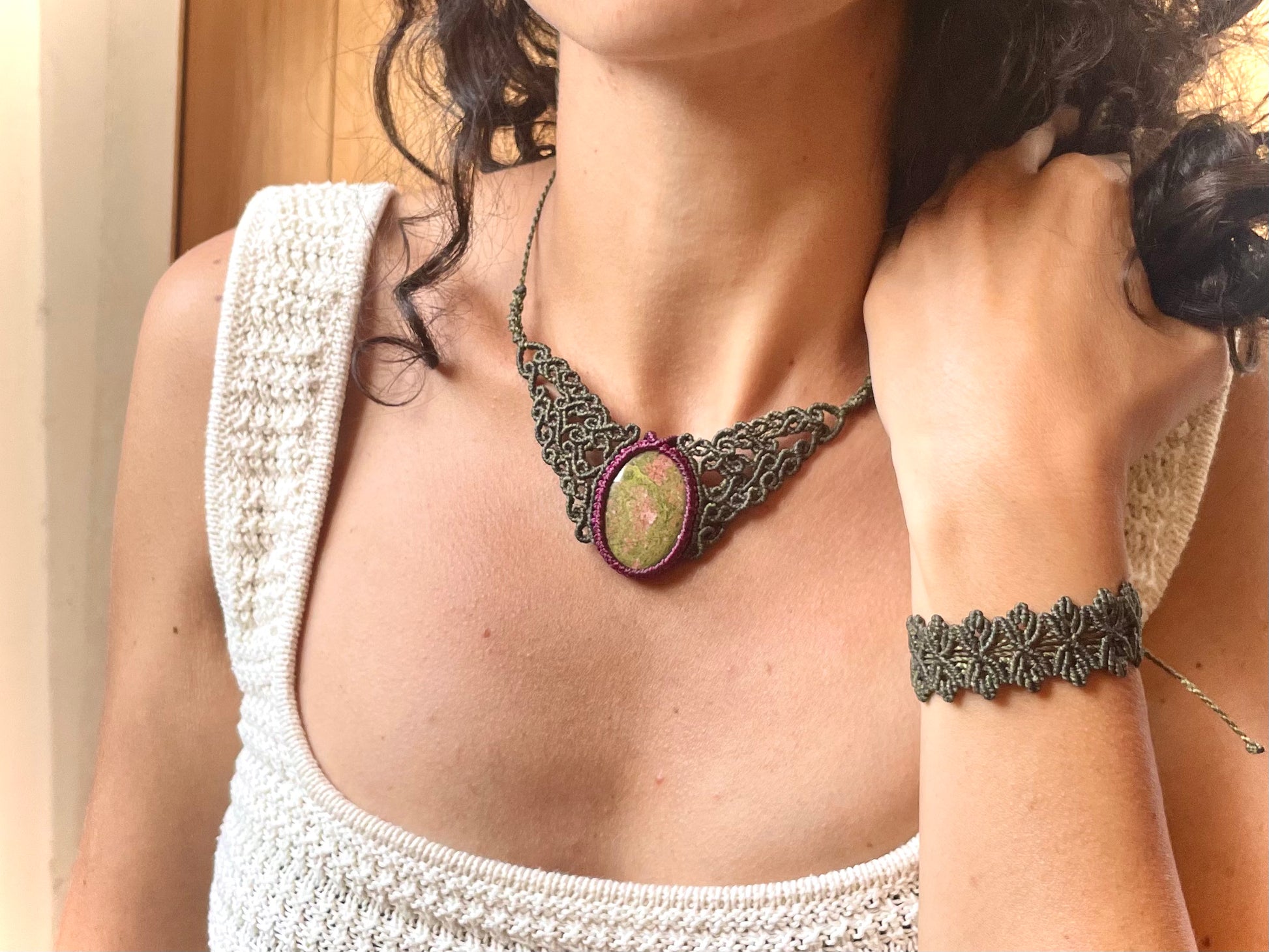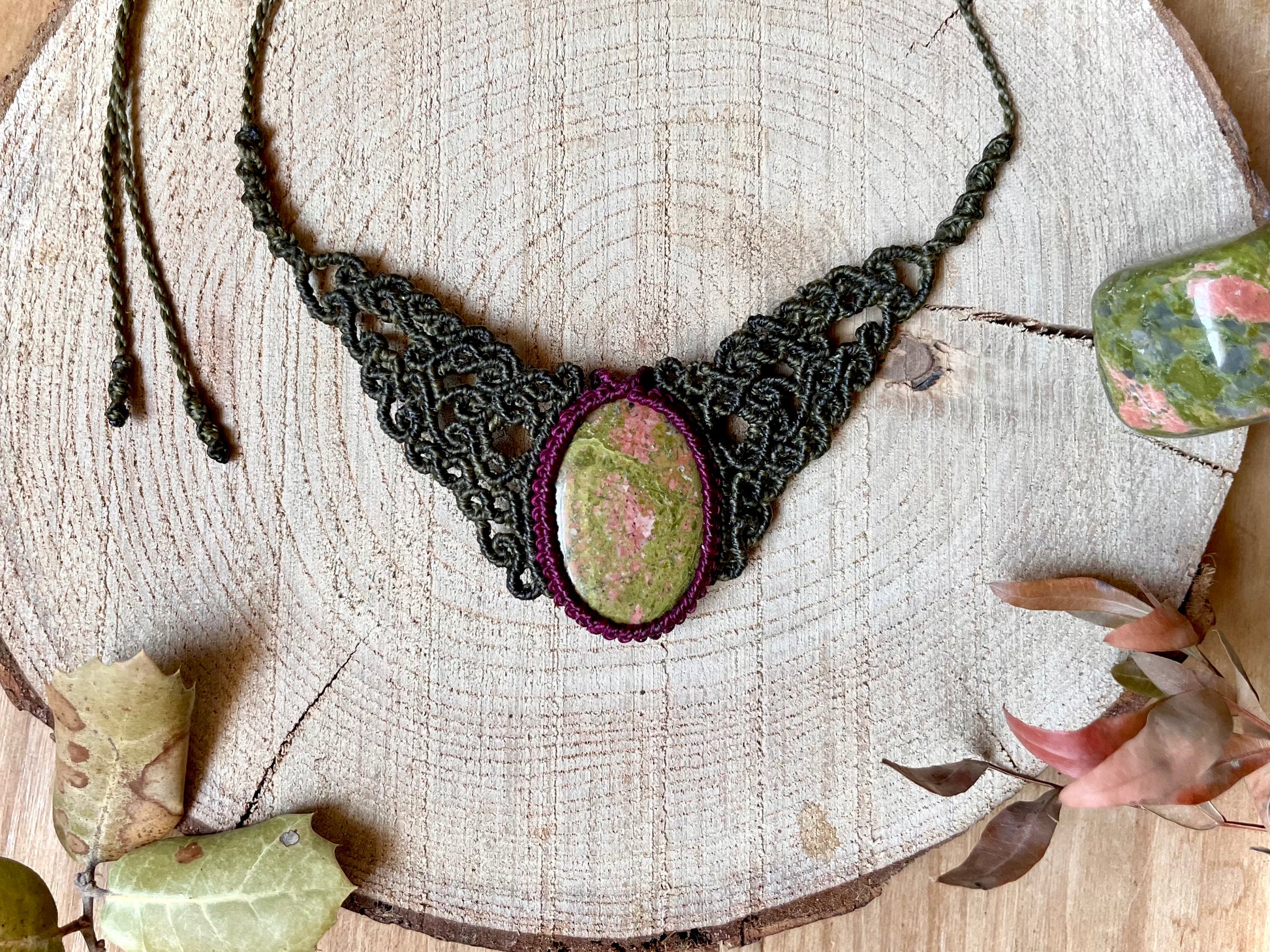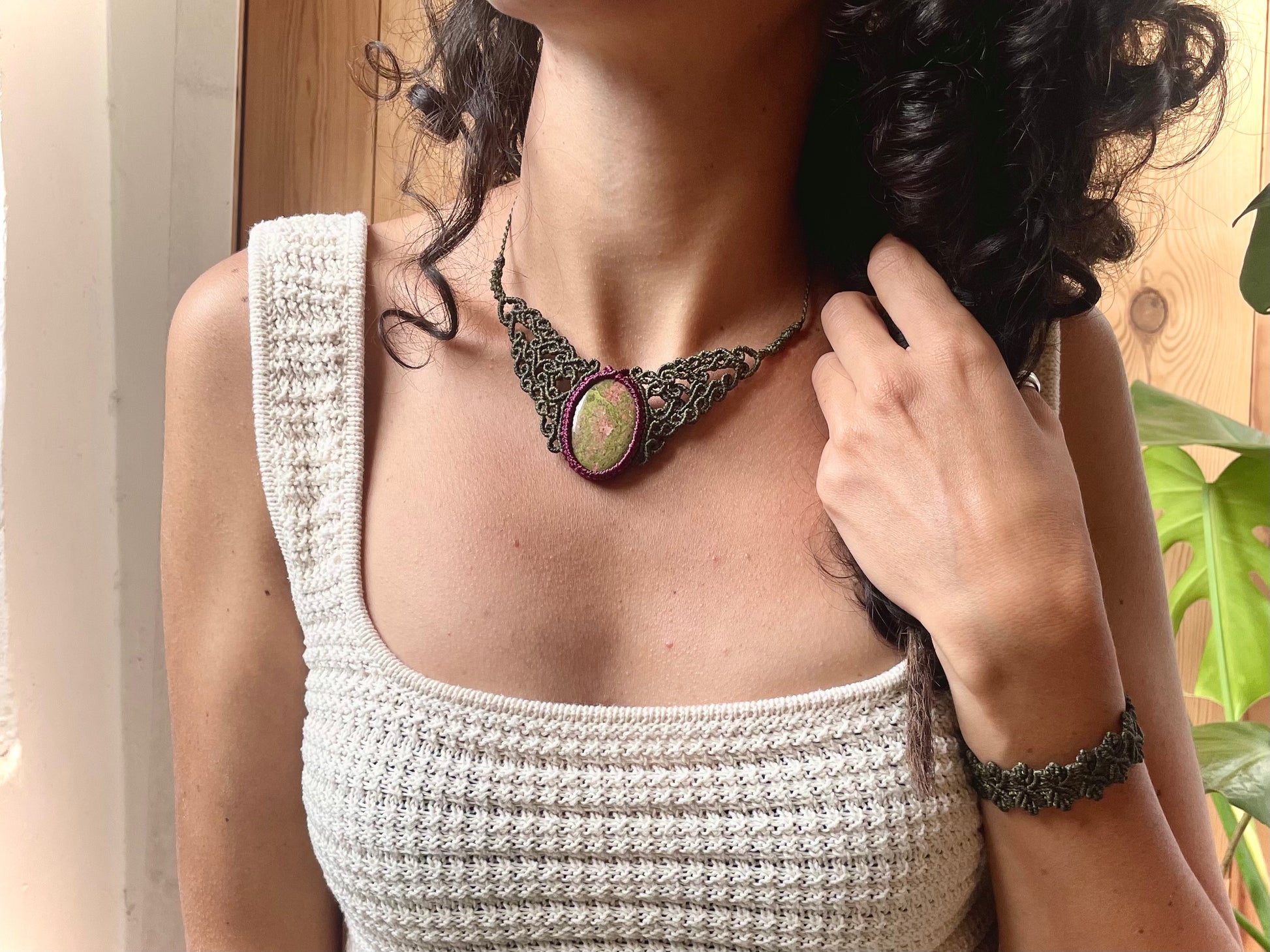 Collar estilo gargantilla con piedra Unakita engarzado en hilo encerado morado y con un tejido en verde oliva que harán de esta gargantilla un accesorio único y especial para cualquier ocasión.