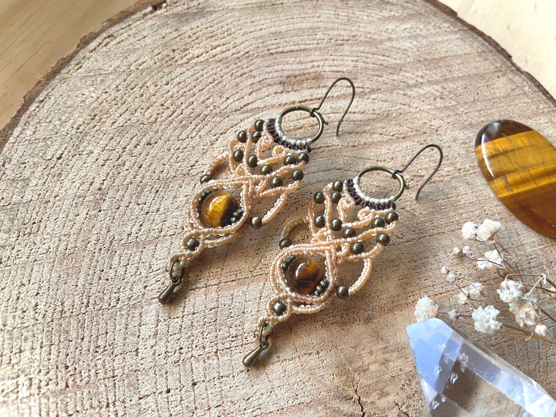Pendientes artesanales tejidos en macramé con hilo encerado color beige, donde el ojo de tigre se convierte en el centro de atención. Los detalles en latón aportan un brillo sutil y elegante, creando un equilibrio perfecto entre lo natural y lo sofisticado.