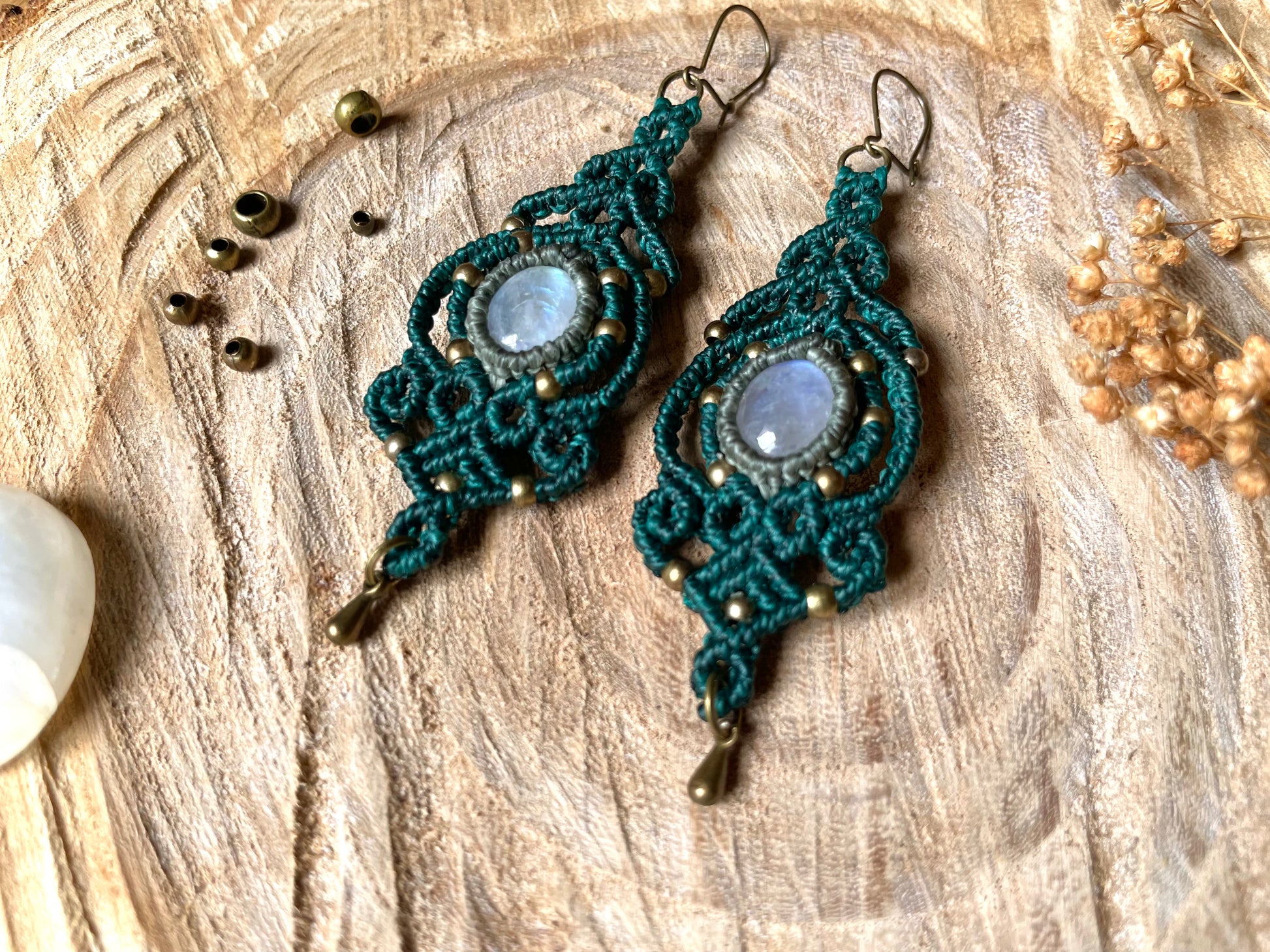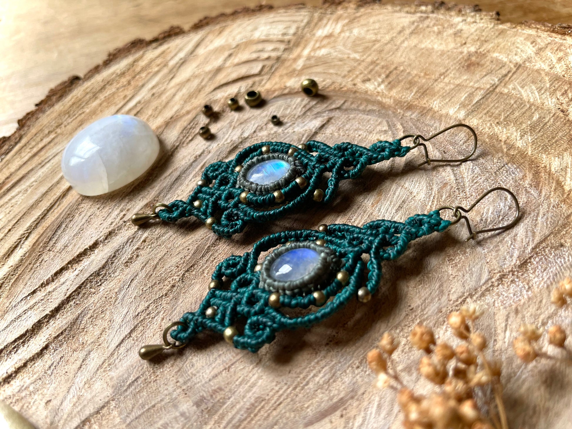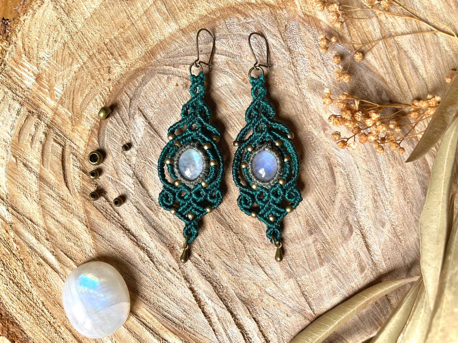 Pendientes con piedra de luna y detalles en latón, tejidos con hilo encerado de macramé en azul océano.