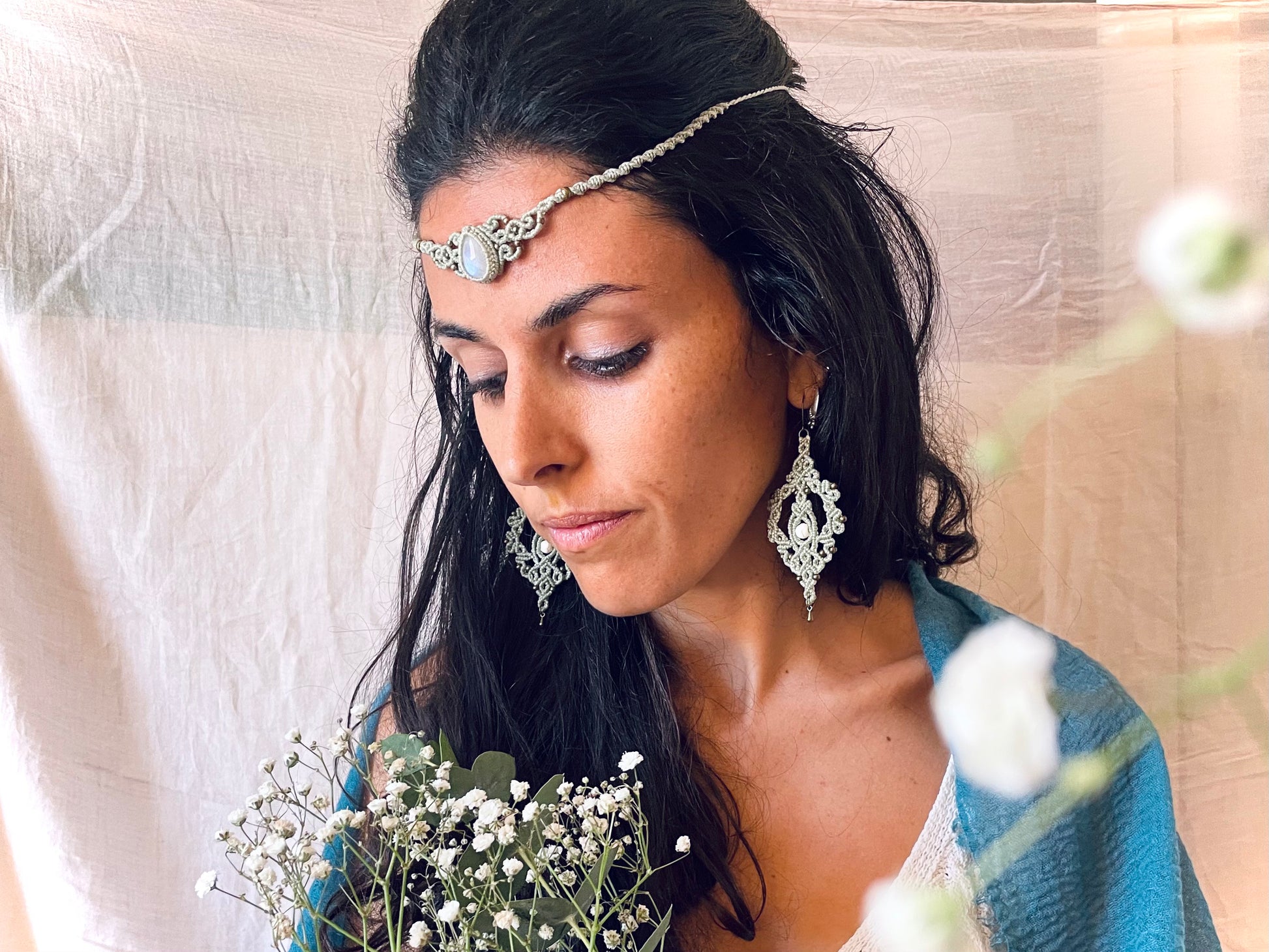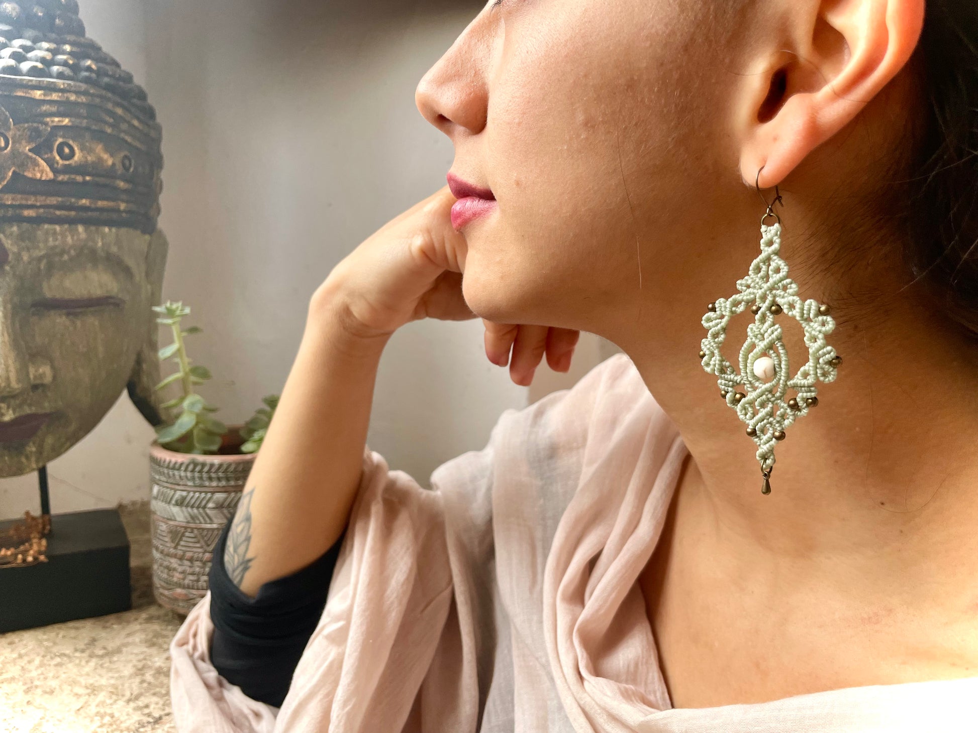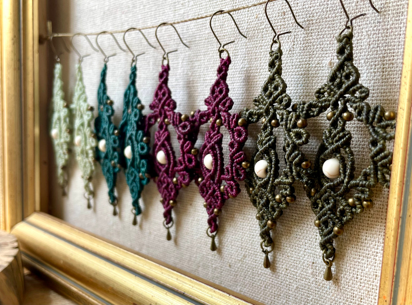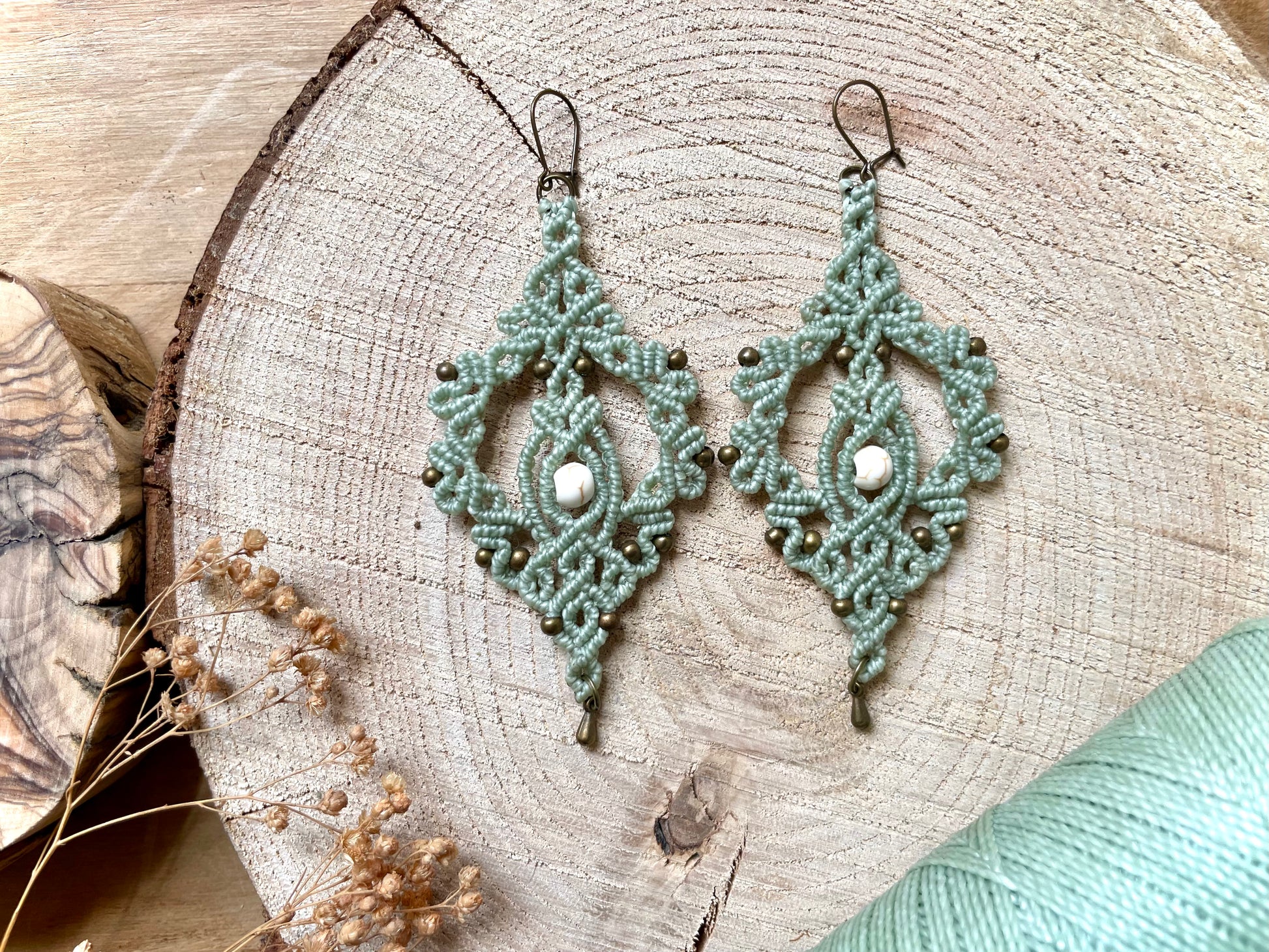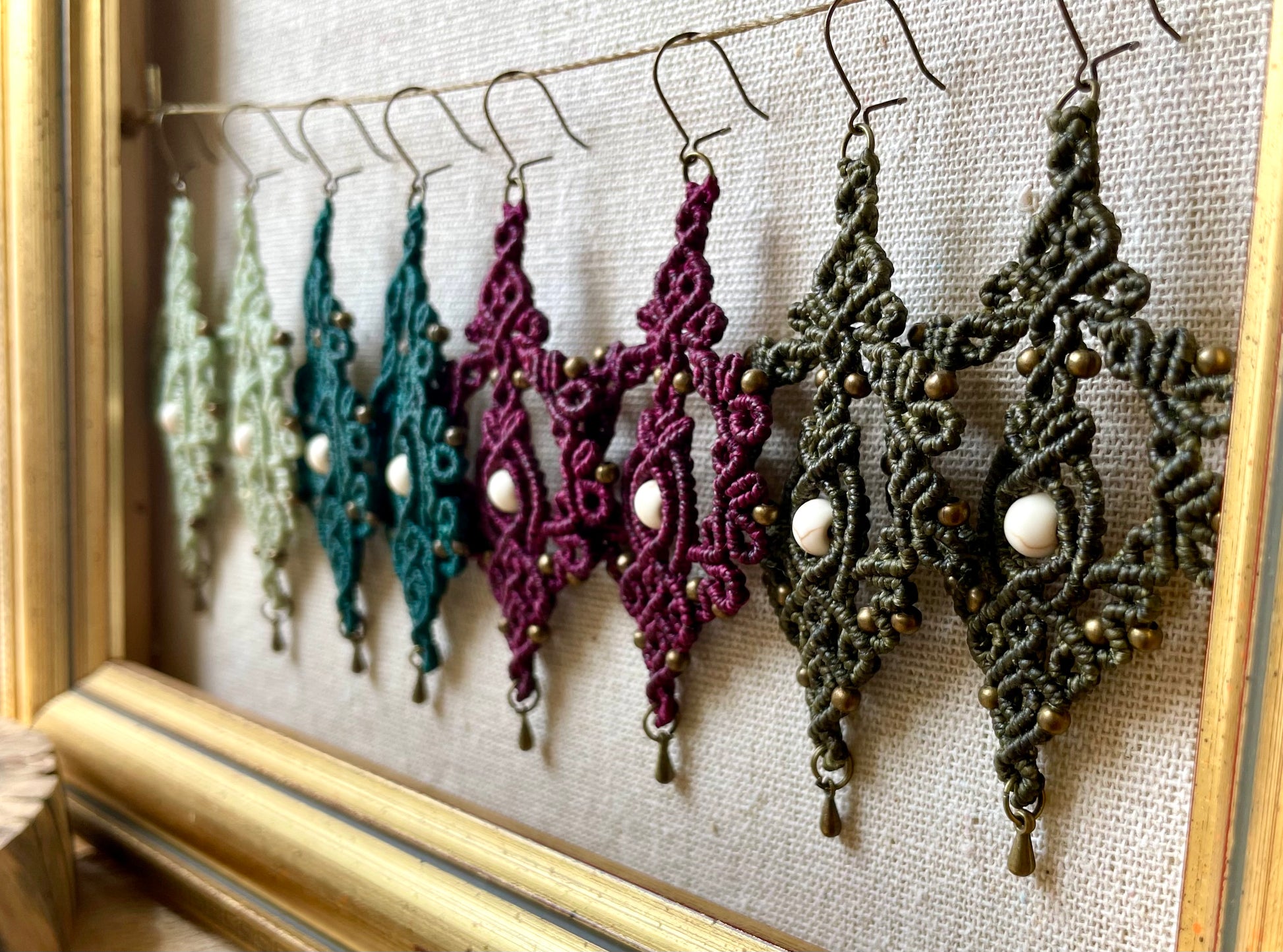 Pendientes de hilo encerado con detalles en latón, tejidos en macramé.
