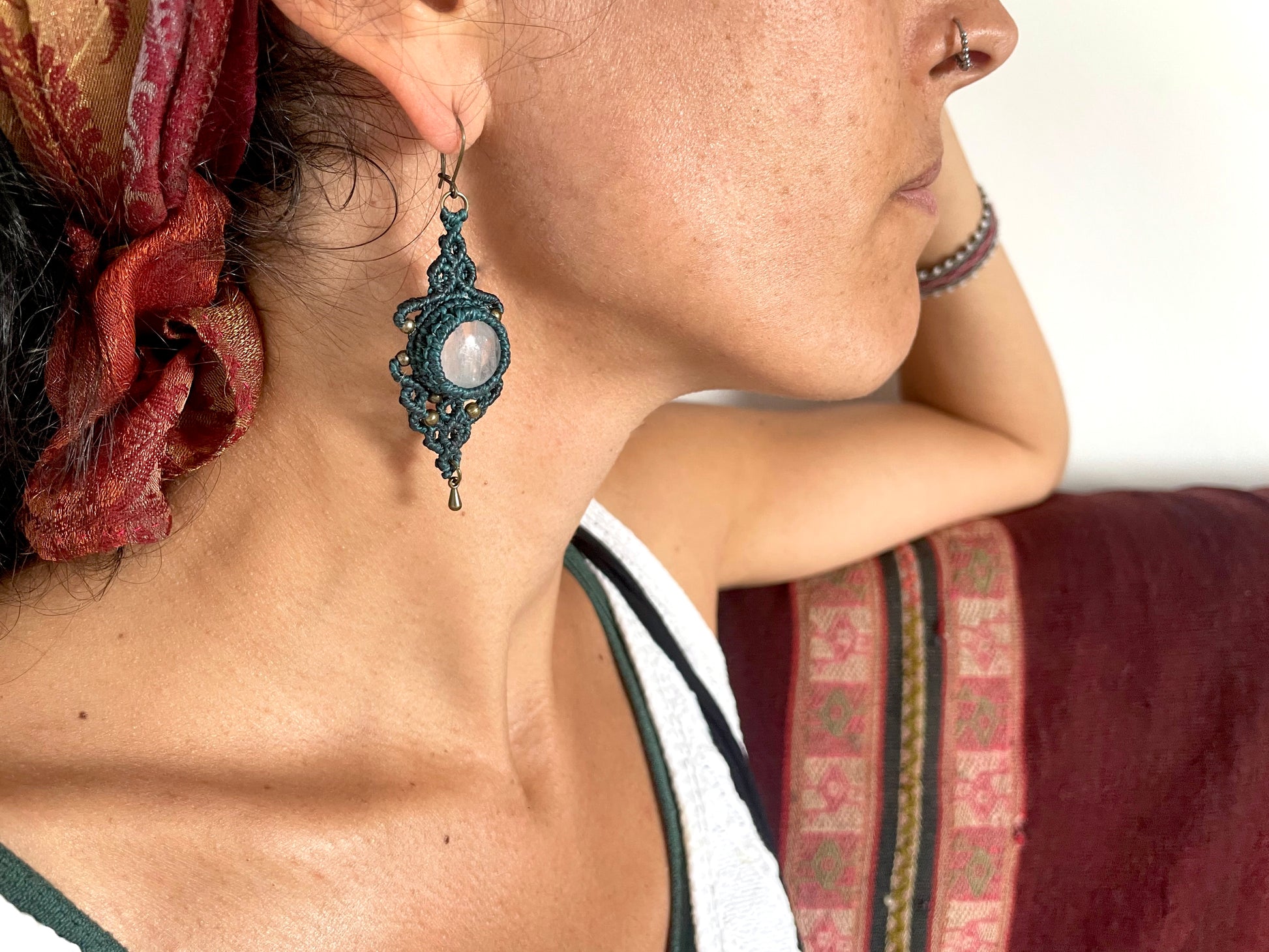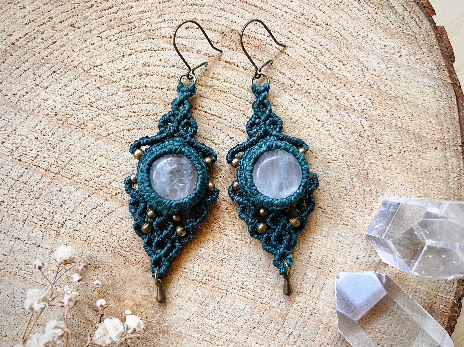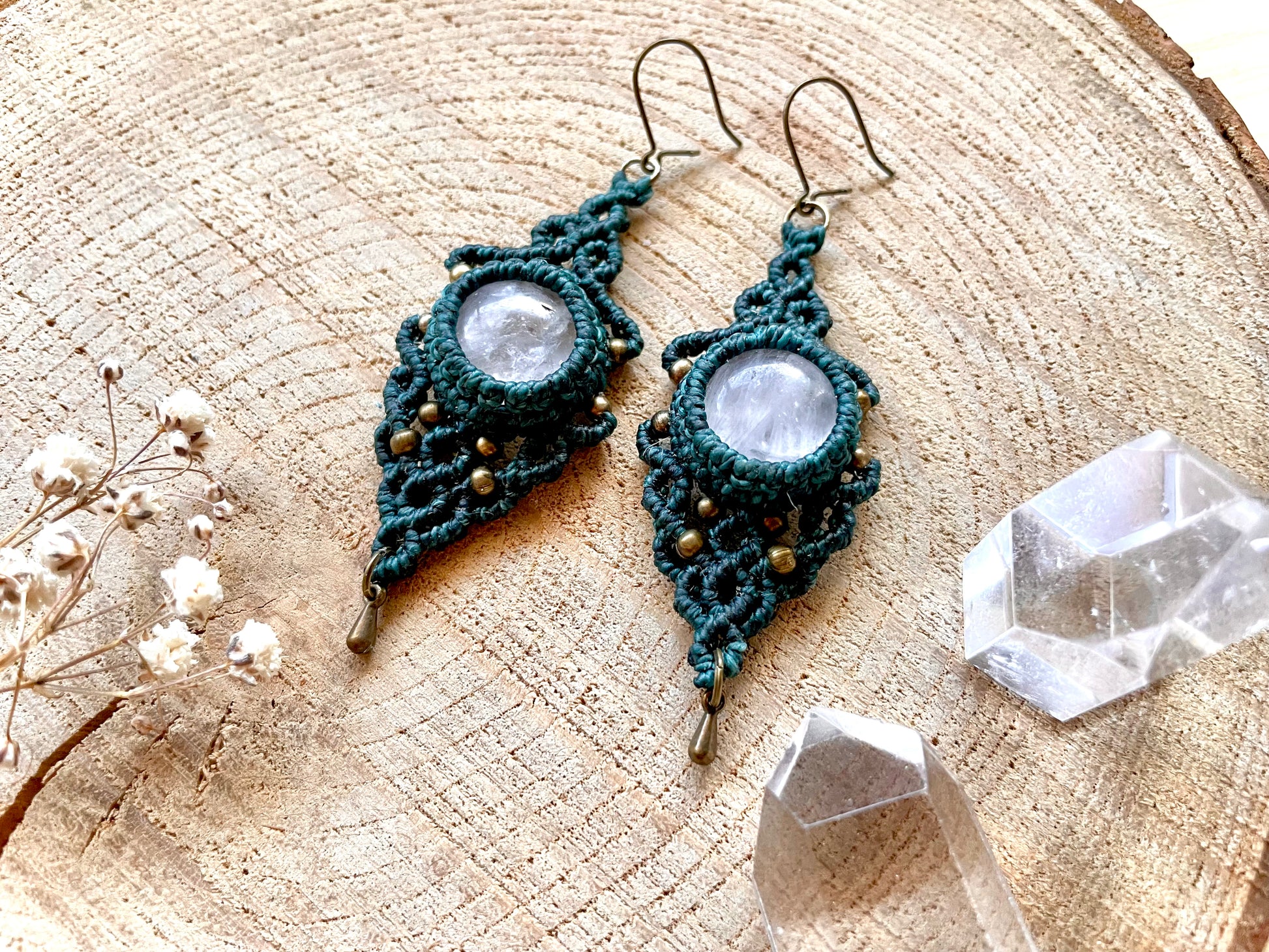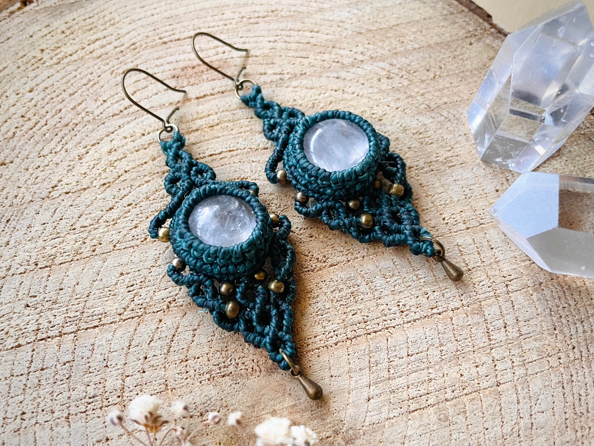 Pendientes tejidos a mano en macramé con hilo azul océano, ligeros y llenos de movimiento, que abrazan un cuarzo natural como pieza central. Cada nudo está hecho con cuidado artesanal, creando un diseño único que resaltará con cualquier conjunto.