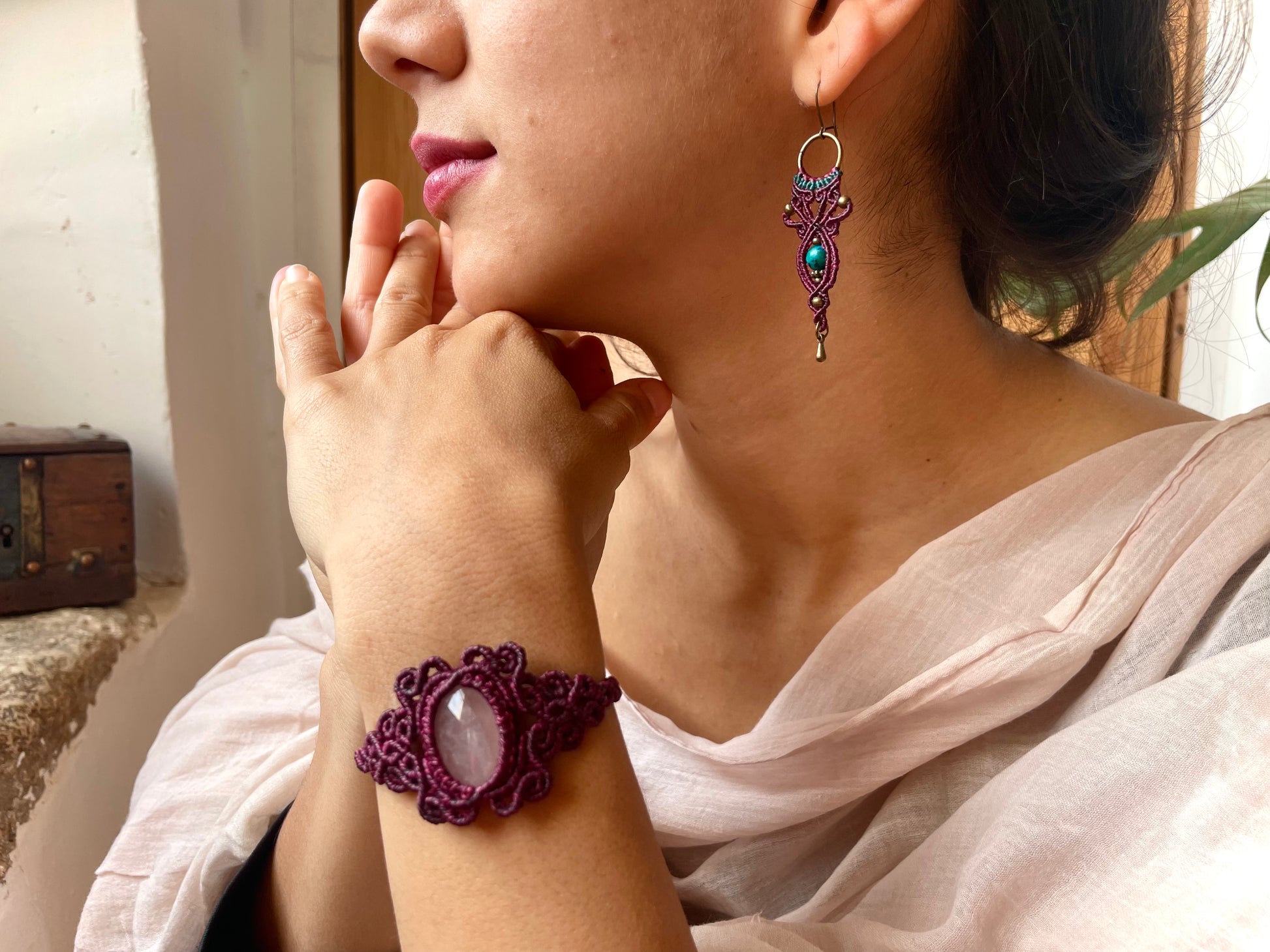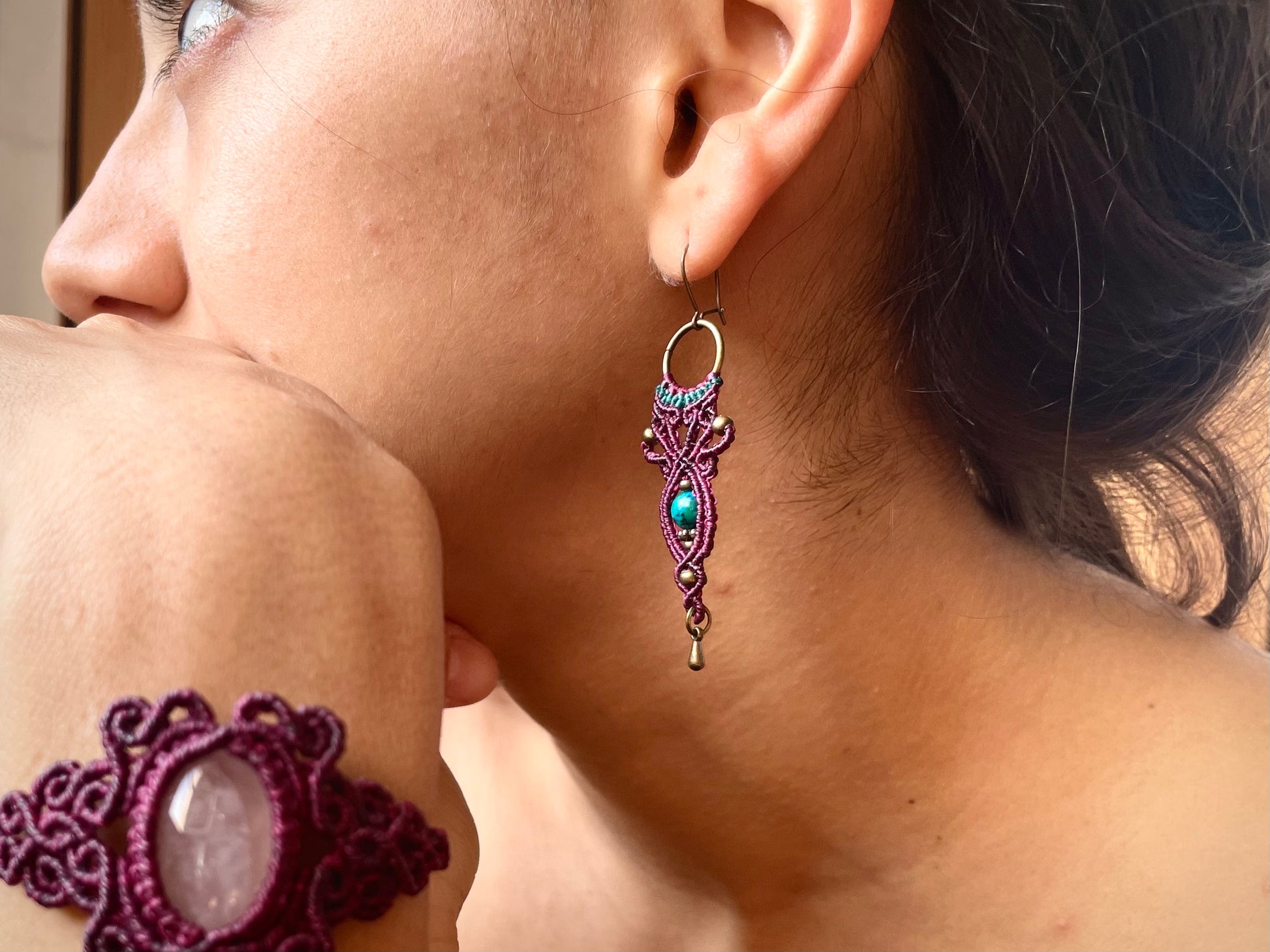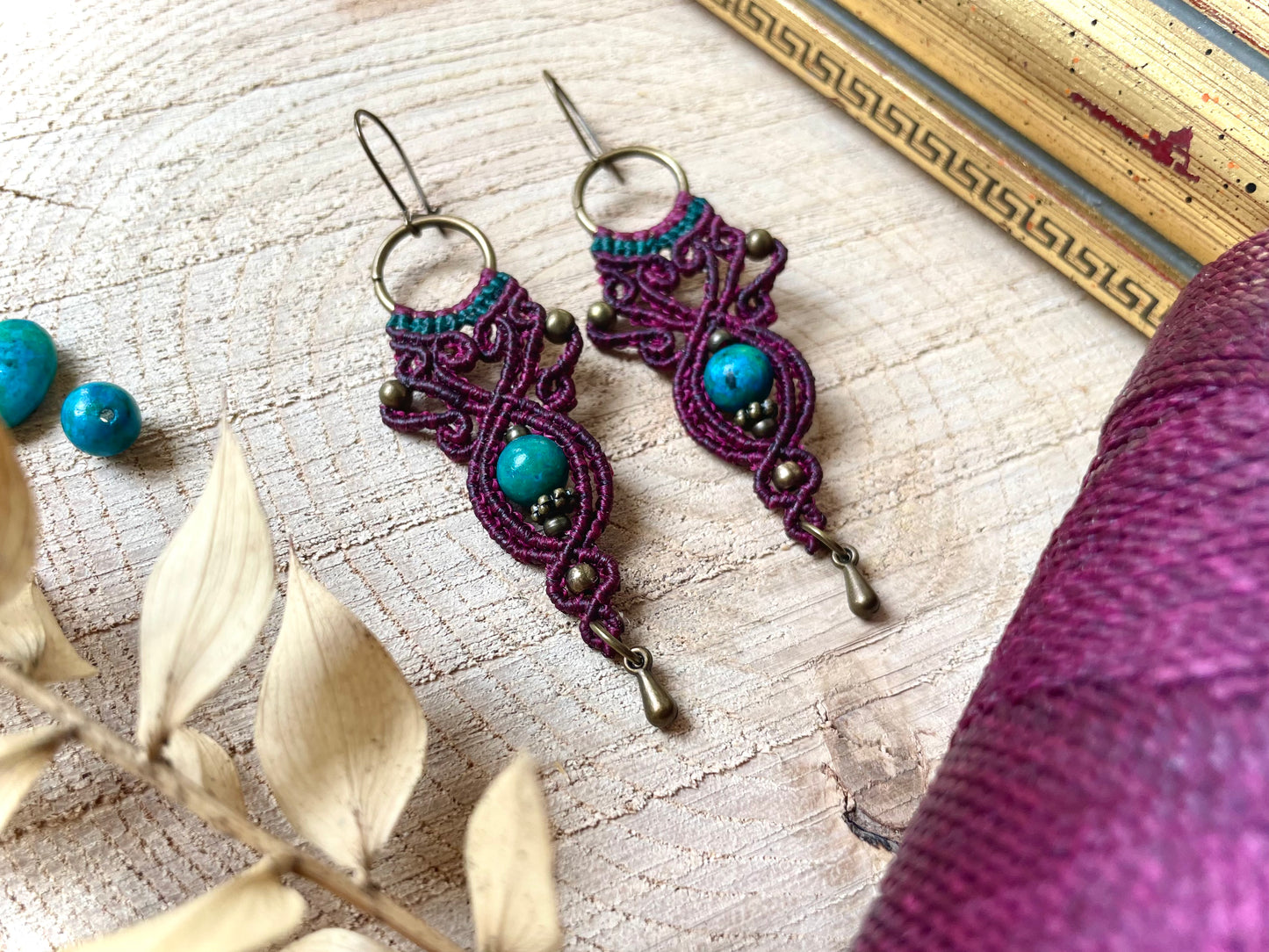 Pendientes elegantes que aportarán un toque de personalidad a cualquier conjunto. Hechos en hilo encerado morado con cuentas de crisocola y latón.