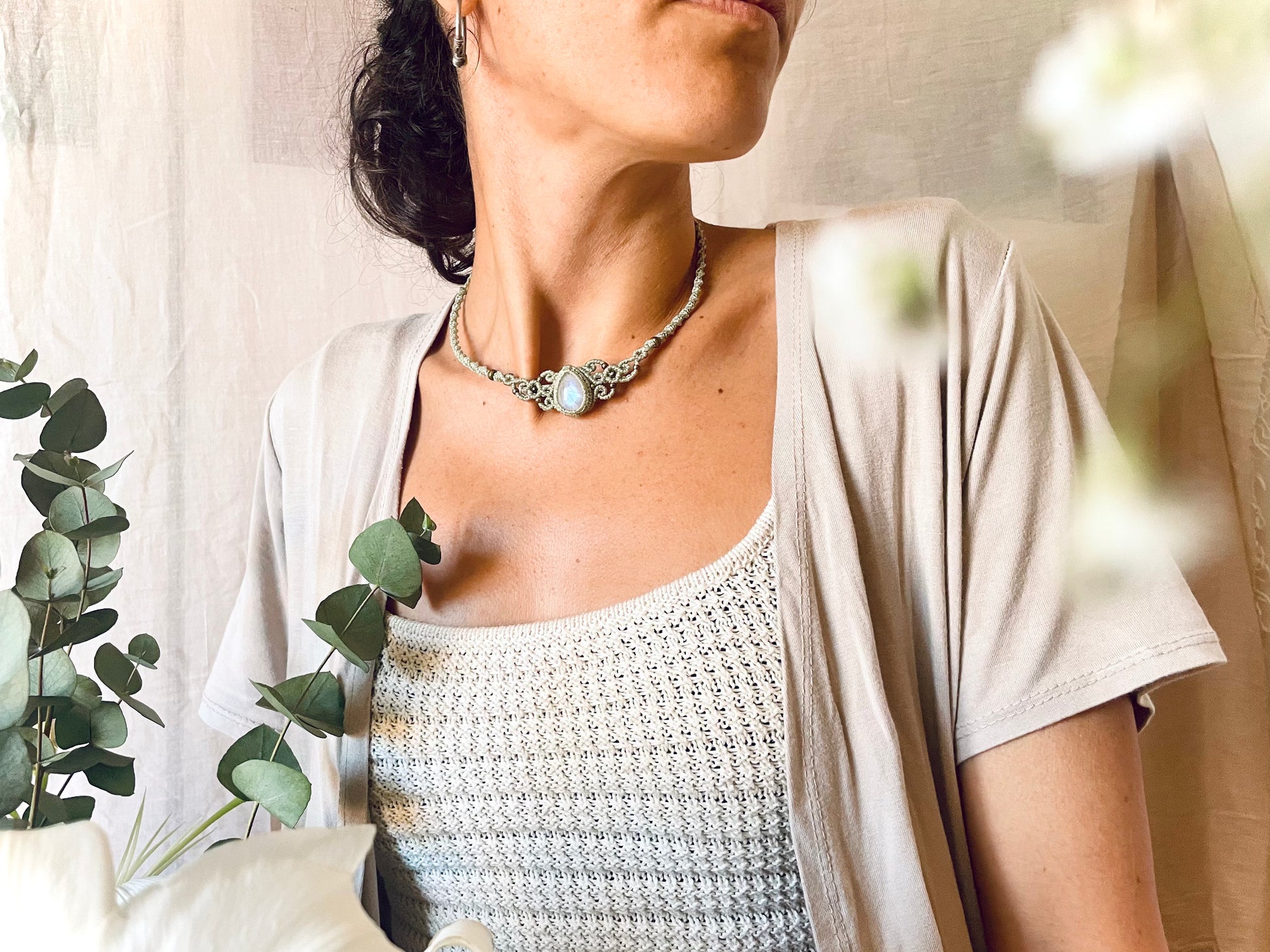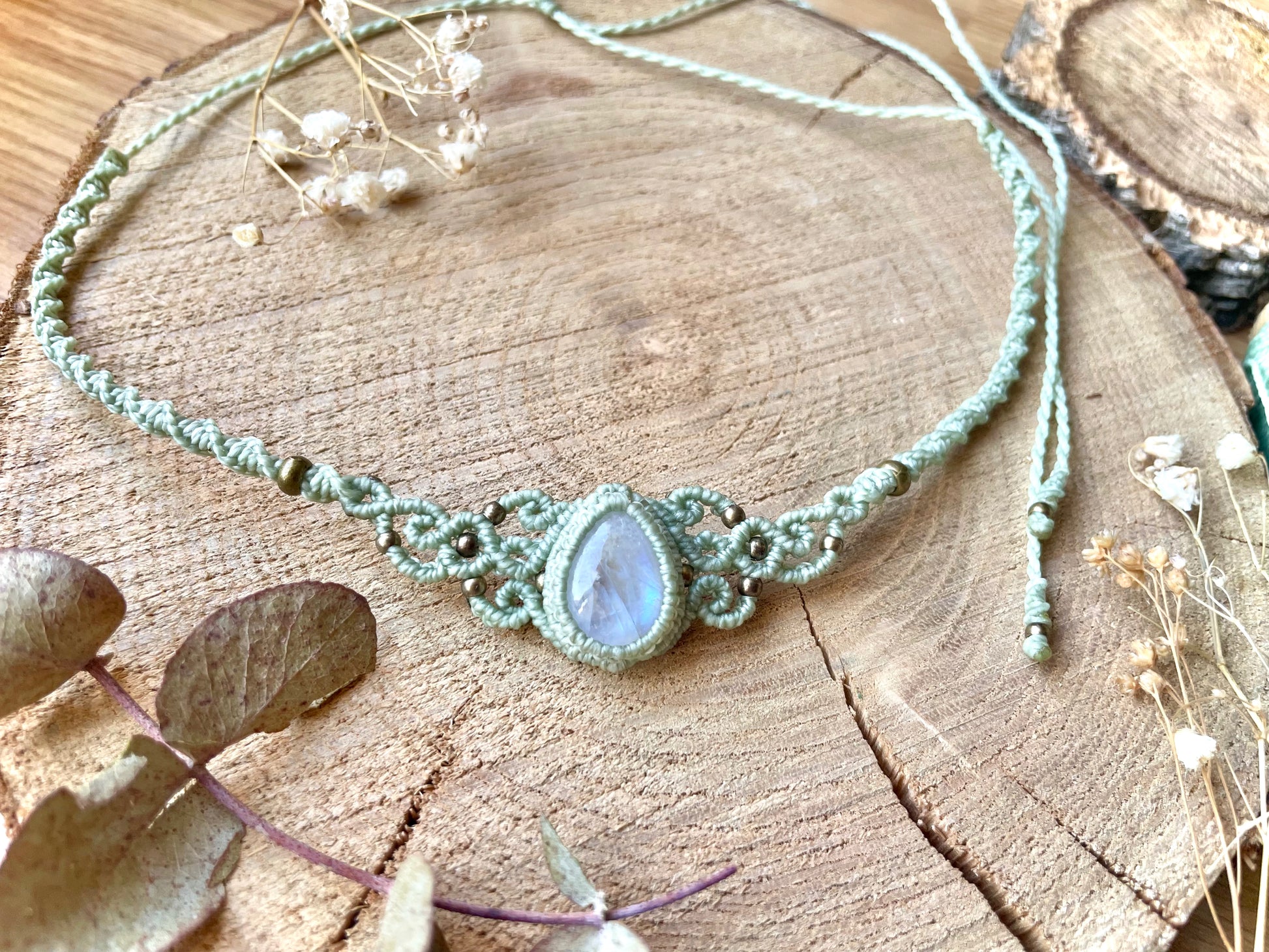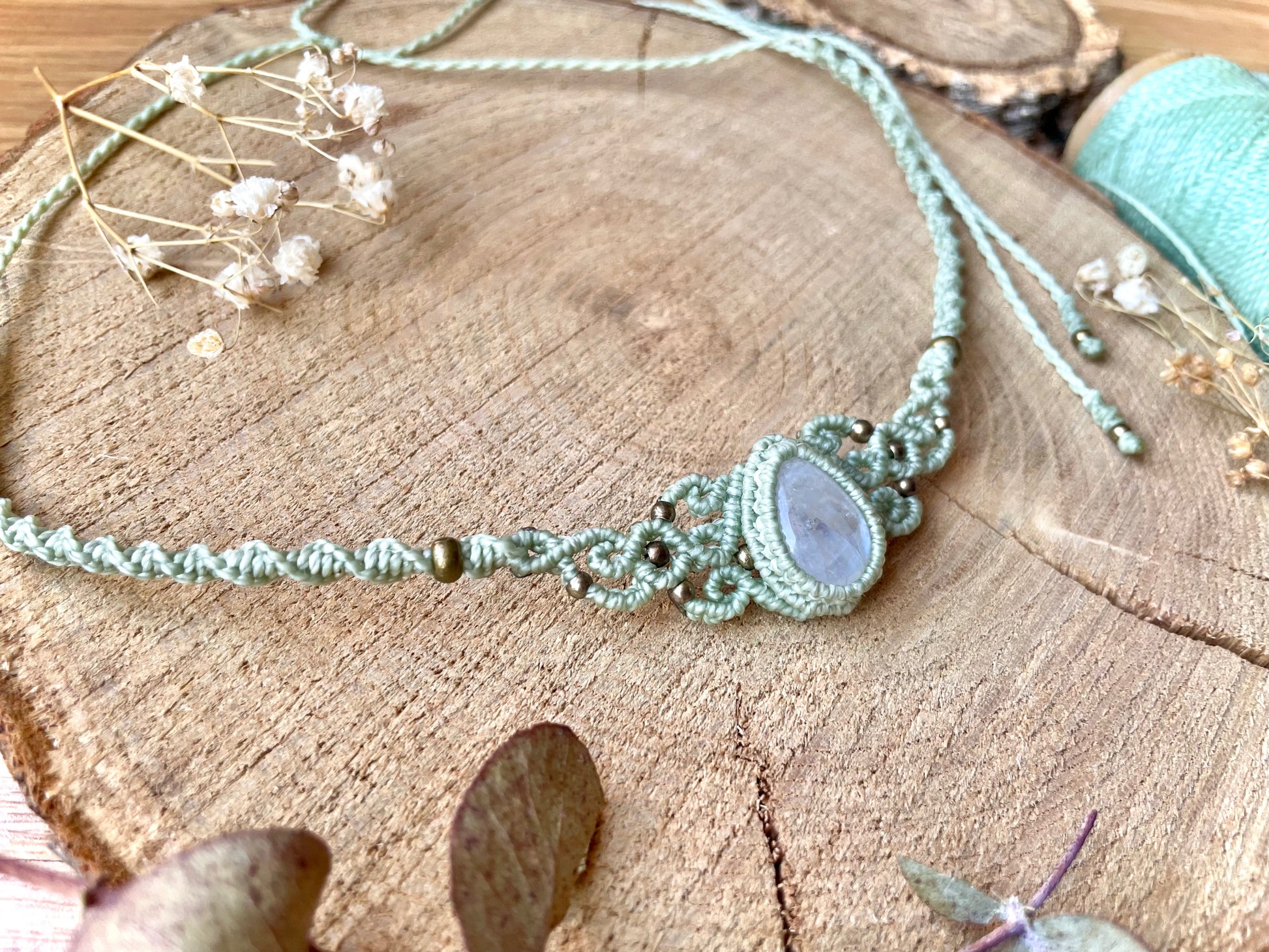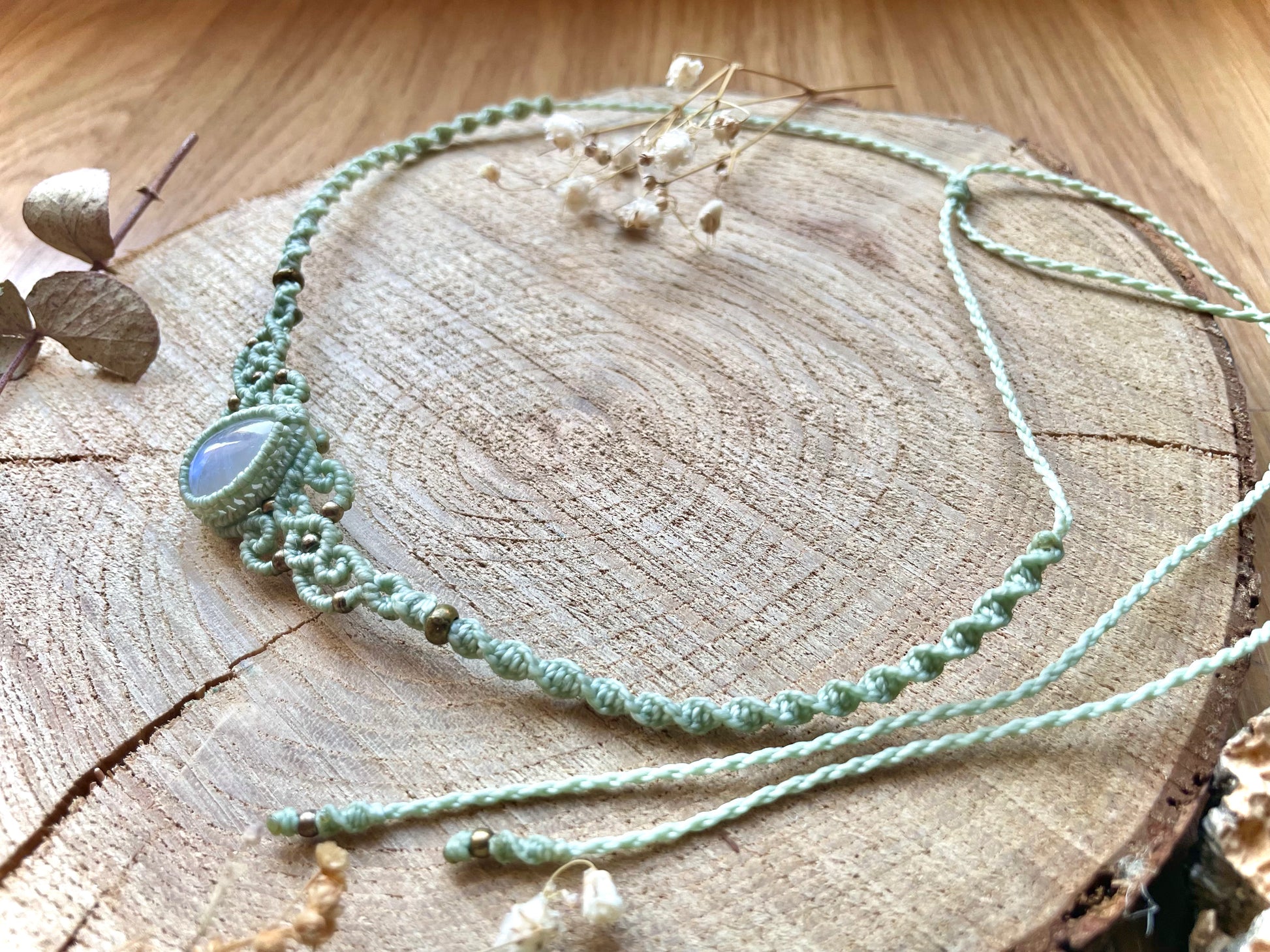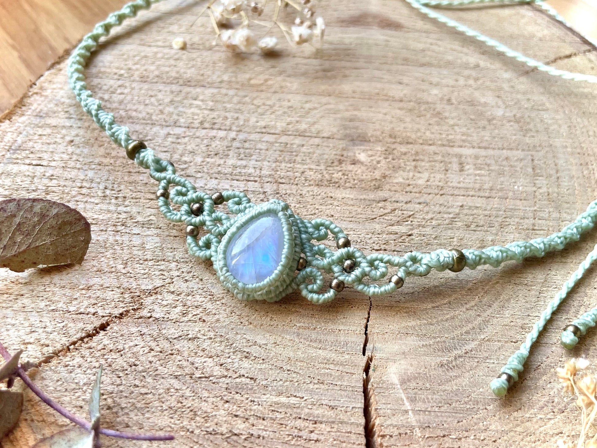 Gargantilla verde aguamarina, con detalles en latón y piedra de luna. Úsala también como tiara para darle un toque bohemio a tus conjuntos de festival y verano.