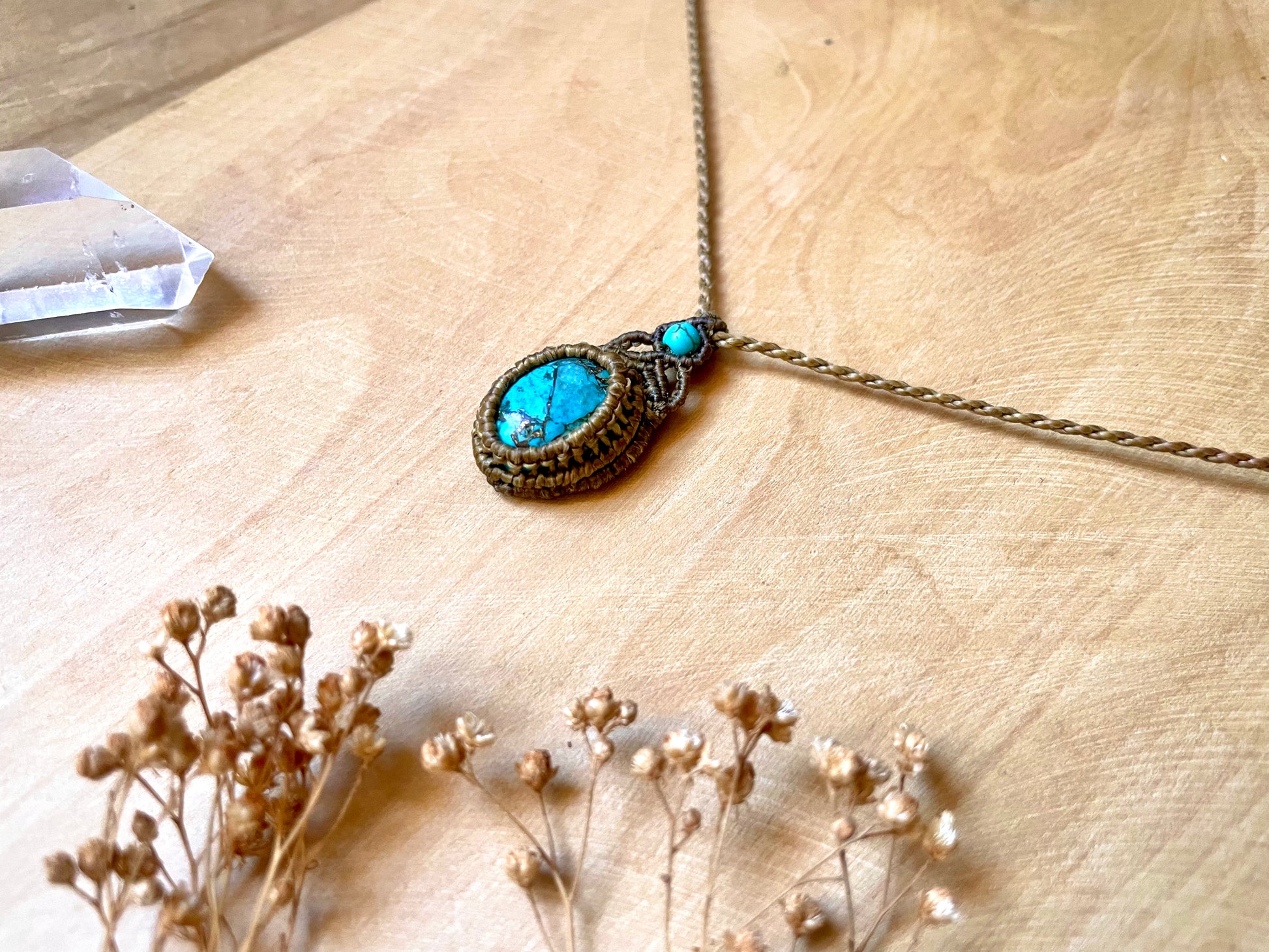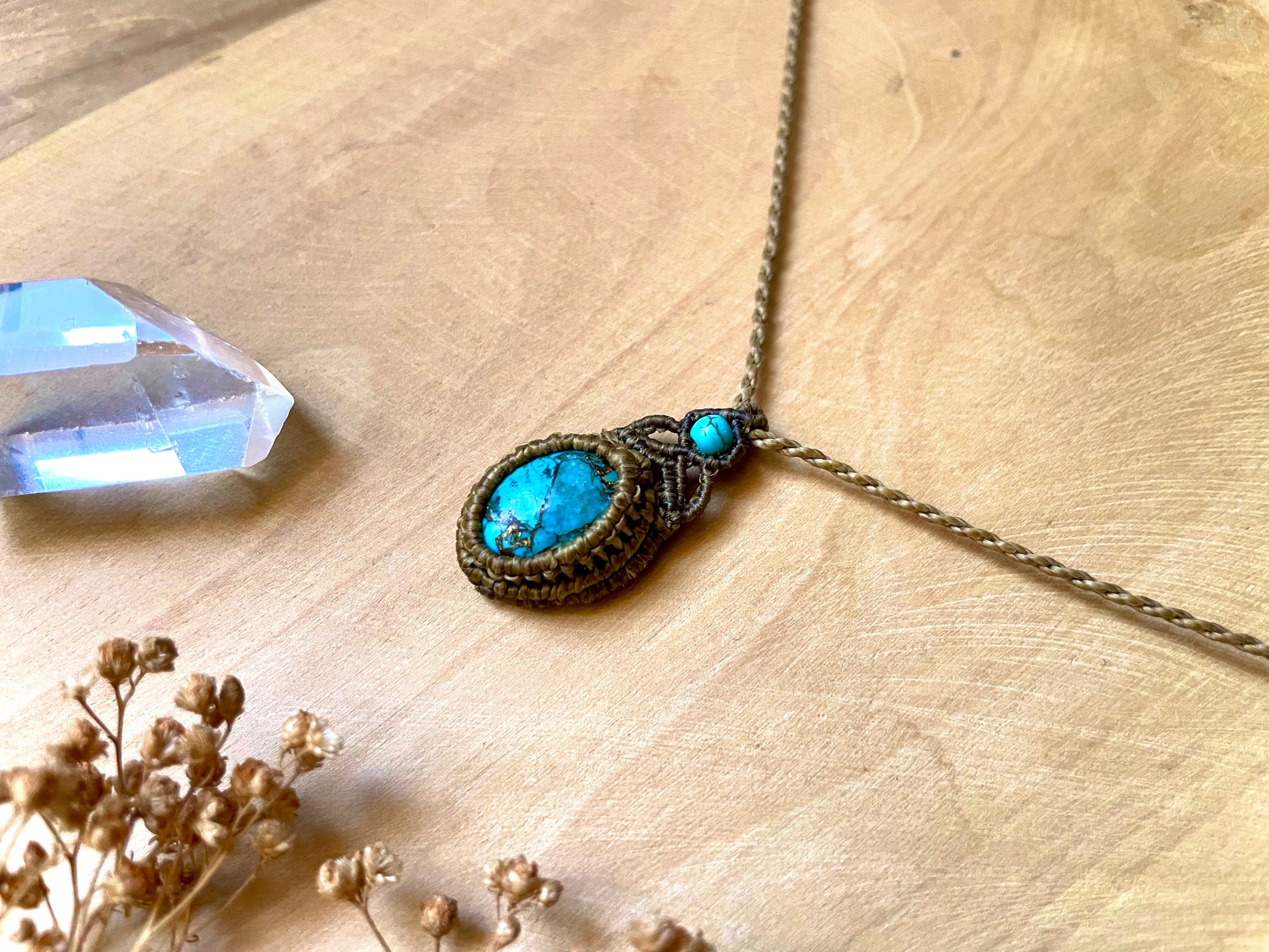Pequeño colgante fino y discreto tejido en macramé con una turquesa de color azul intenso que destaca por su beta de cobre. Pequeño detalle en azul en la parte superior.